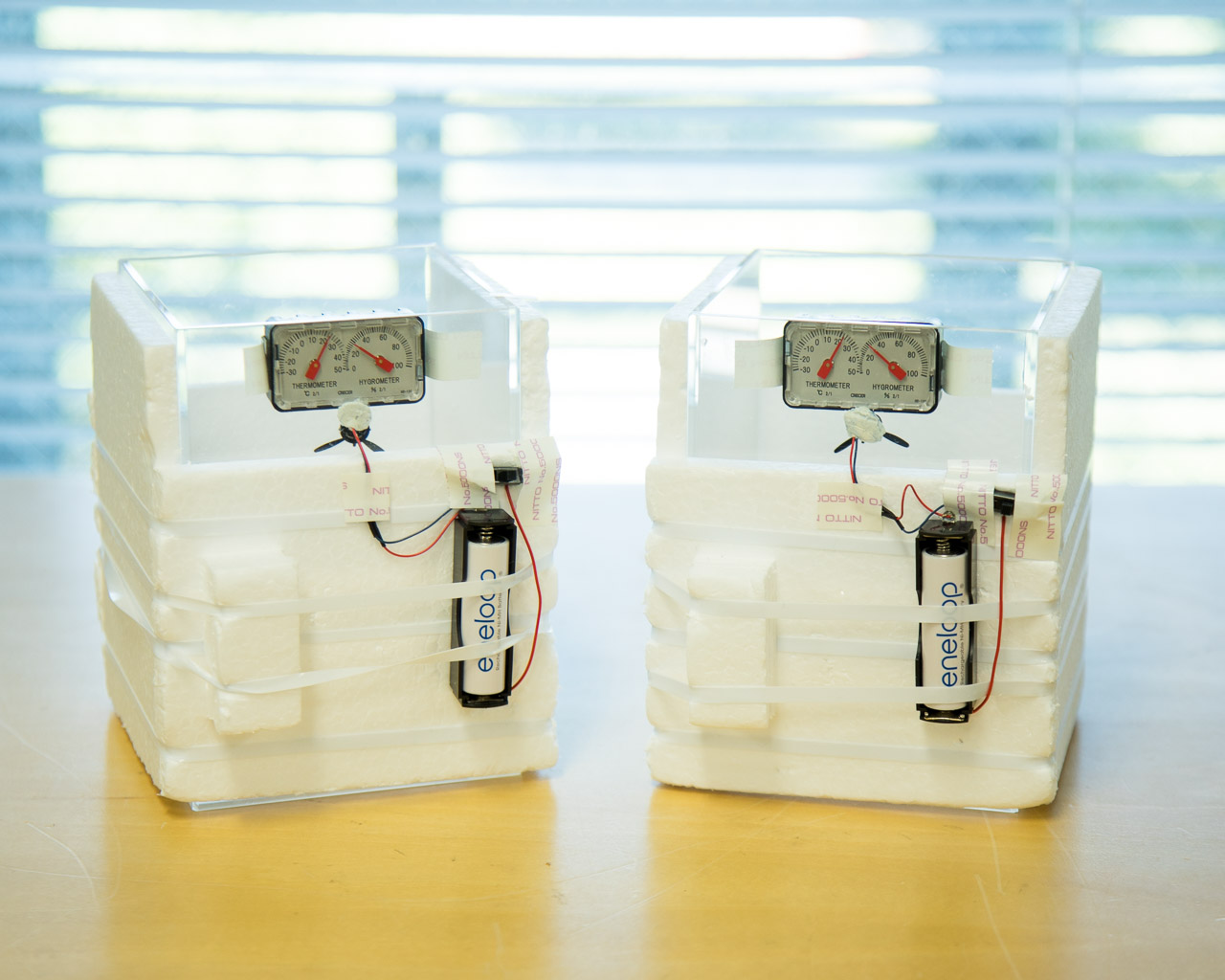 検査装置をさらに改良し、一度に2つ素材を検査できるよう小型化。予備実験で恒温恒湿装置の操作方法などをマスターした上で、いよいよ本実験に望みます。