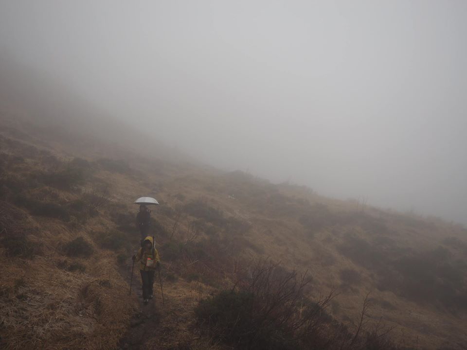 乳頭山の山頂付近では風速20mの暴風に見舞われた。頭上には重く暗い雲がかかり、吹雪で顔を上げることもできず、下を向いて一歩づつ踏みしめながら歩いた。