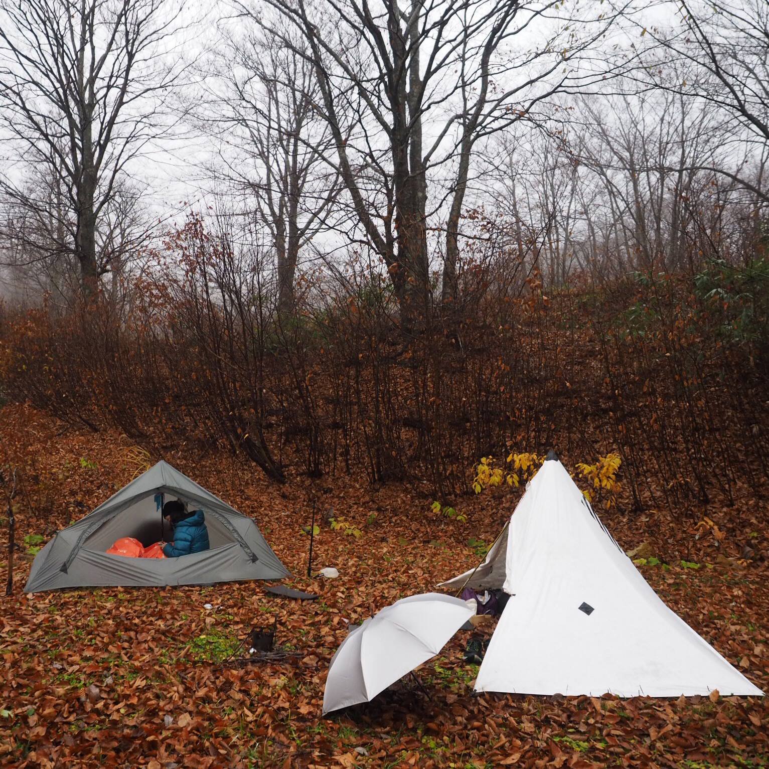 翌日以降、山を歩くたびに浸かった秘湯では至福を感じ、雨まじりの曇天のミストハイクではなだらかな稜線を歩き、落ち葉を踏みしめて晩秋を存分に味わった。夜は小さな焚火を囲んで酒とアテでその日の自分たちの足跡を讃え、明日の幸運を願った。