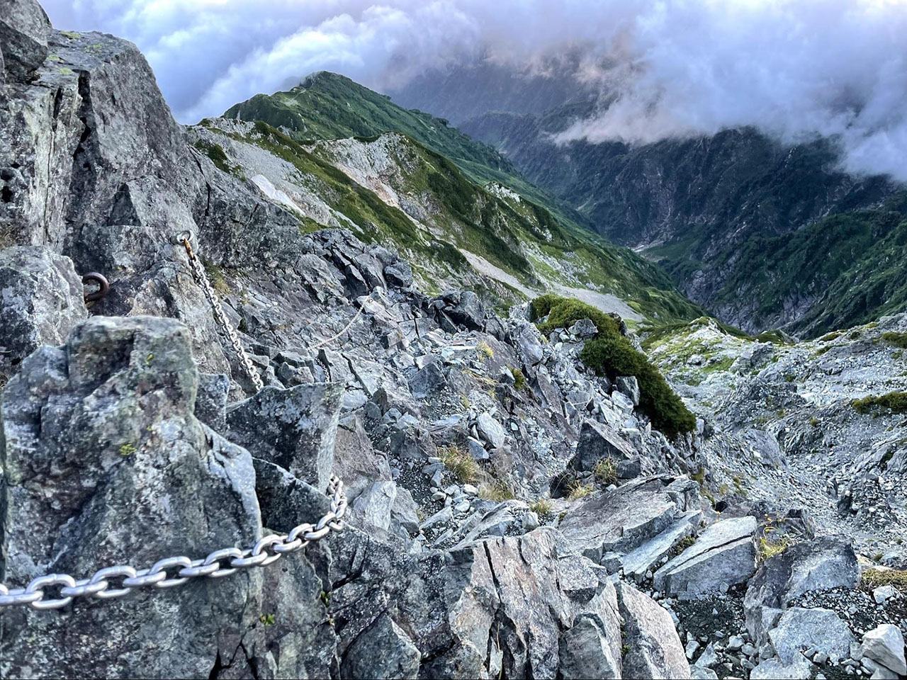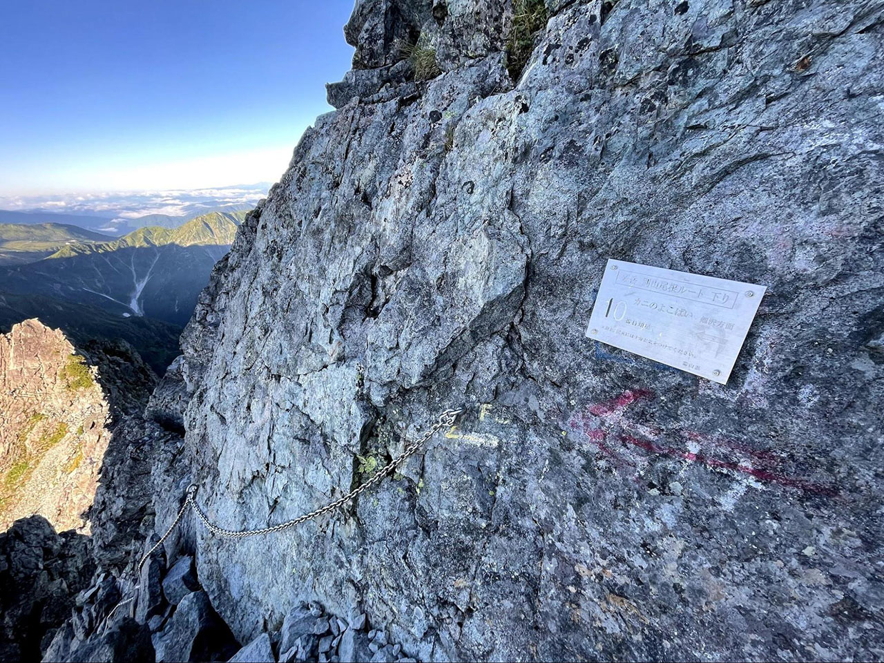 結局剱の山頂で過ごした時間は10分弱。もっとゆっくりとしていたかったが、早月尾根は水場がなく水筒も空になりかけていたため、陽が高くなり暑くなる前に先を急ぐことにした。別山尾根から室堂方面に下りる。一般に剱で難所とされるのはこのルートで、高度感のある岩場が続く。平安時代に登った先人達に敬意を払い、ここまで鎖やボルトに頼らず進んできたが、有名な難所「カニのヨコバイ」はボルトに頼らないと下りることができなかった。