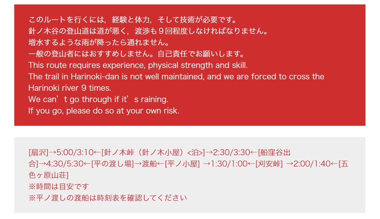 船で黒部湖の対岸に渡り、針ノ木谷に向かう。下調べで見た五色ヶ原山荘のサイトには恐ろしげな説明文が載っていた。