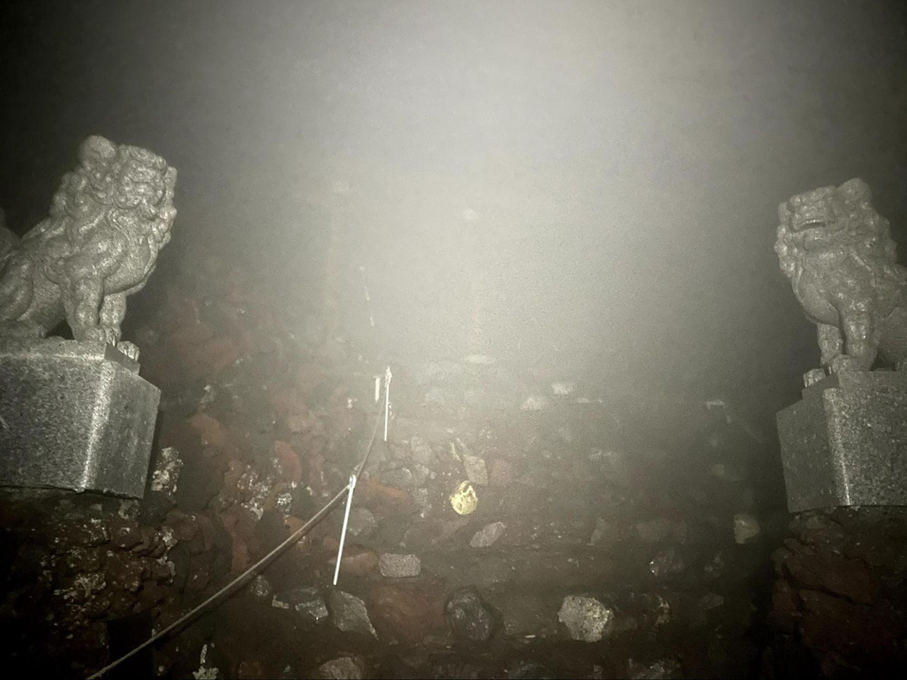 濃い霧の中、ヘッドライトの灯りに久須志神社の狛犬と鳥居がぼんやりと浮かび上がる。鳥居をくぐって山頂に出たとたん、身体をもっていかれるほどの強風を受ける。濃い霧と雨の微粒子でヘッドライトの光が拡散し、大げさではなく1メートル先すら見えない。そもそも強風でまともに前を向いていられない。風が濡れた衣服を身体に押しつけ、体温をみるみる奪っていく。