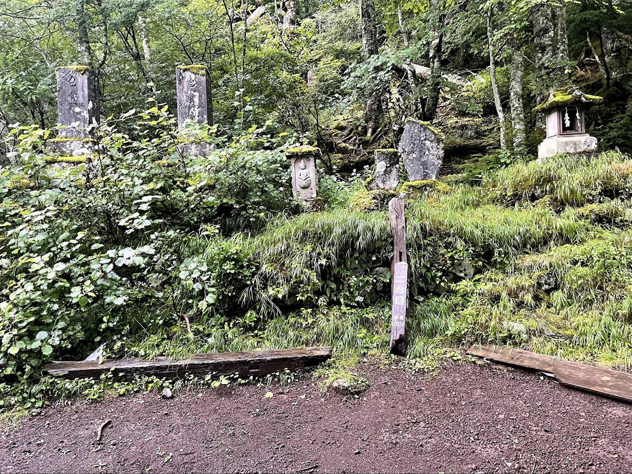 吉田口はこれまで何度も歩いているが、今回は5年ぶり、かつ昼間に通るのは初めてだったので新鮮だった。以前の記憶よりも道や標識の整備が進んでおり、夜は少し無気味な石碑や茶屋の廃屋にも趣を感じる。雨は降り続いているが、水はけもよく歩きやすい。