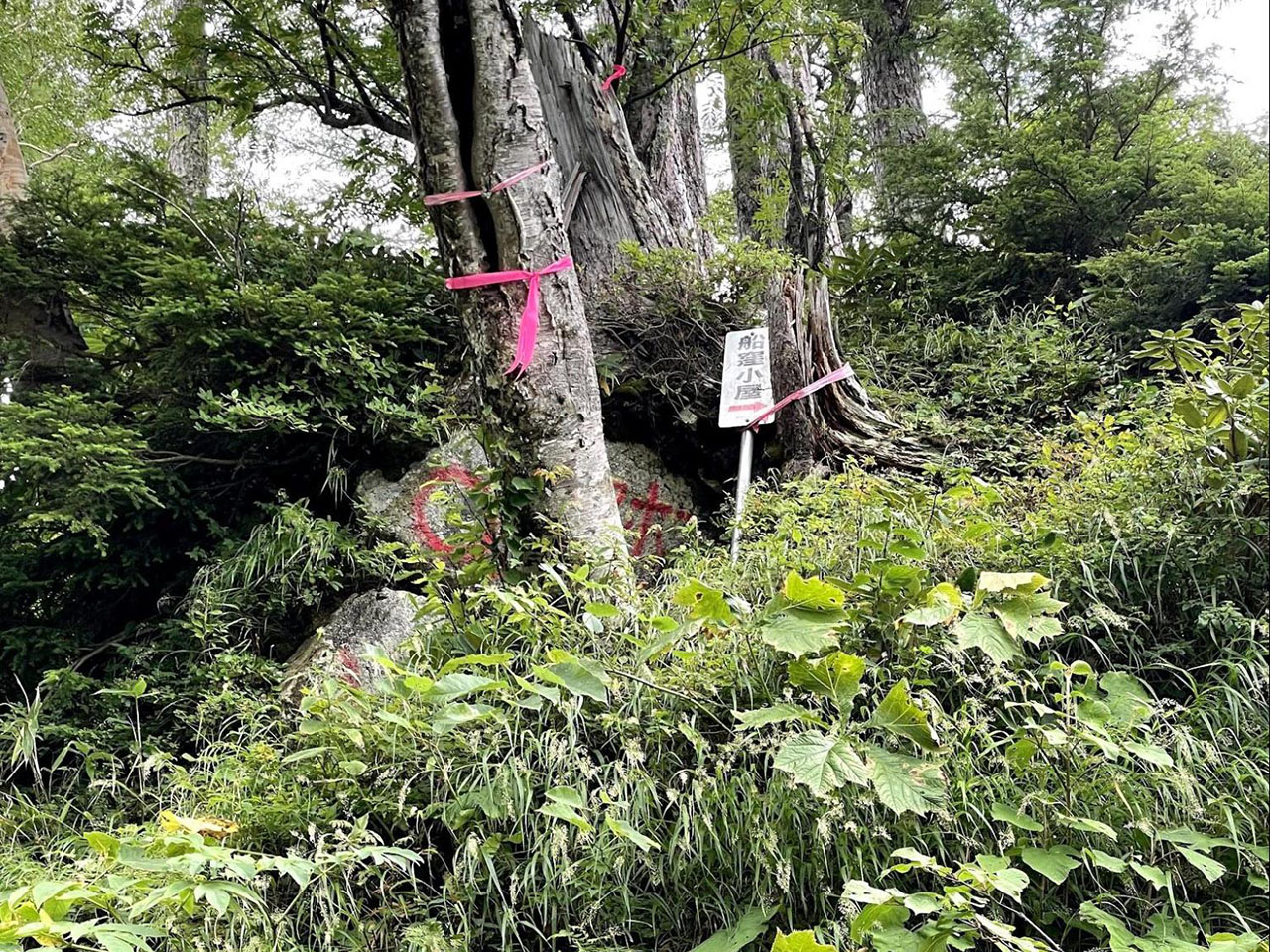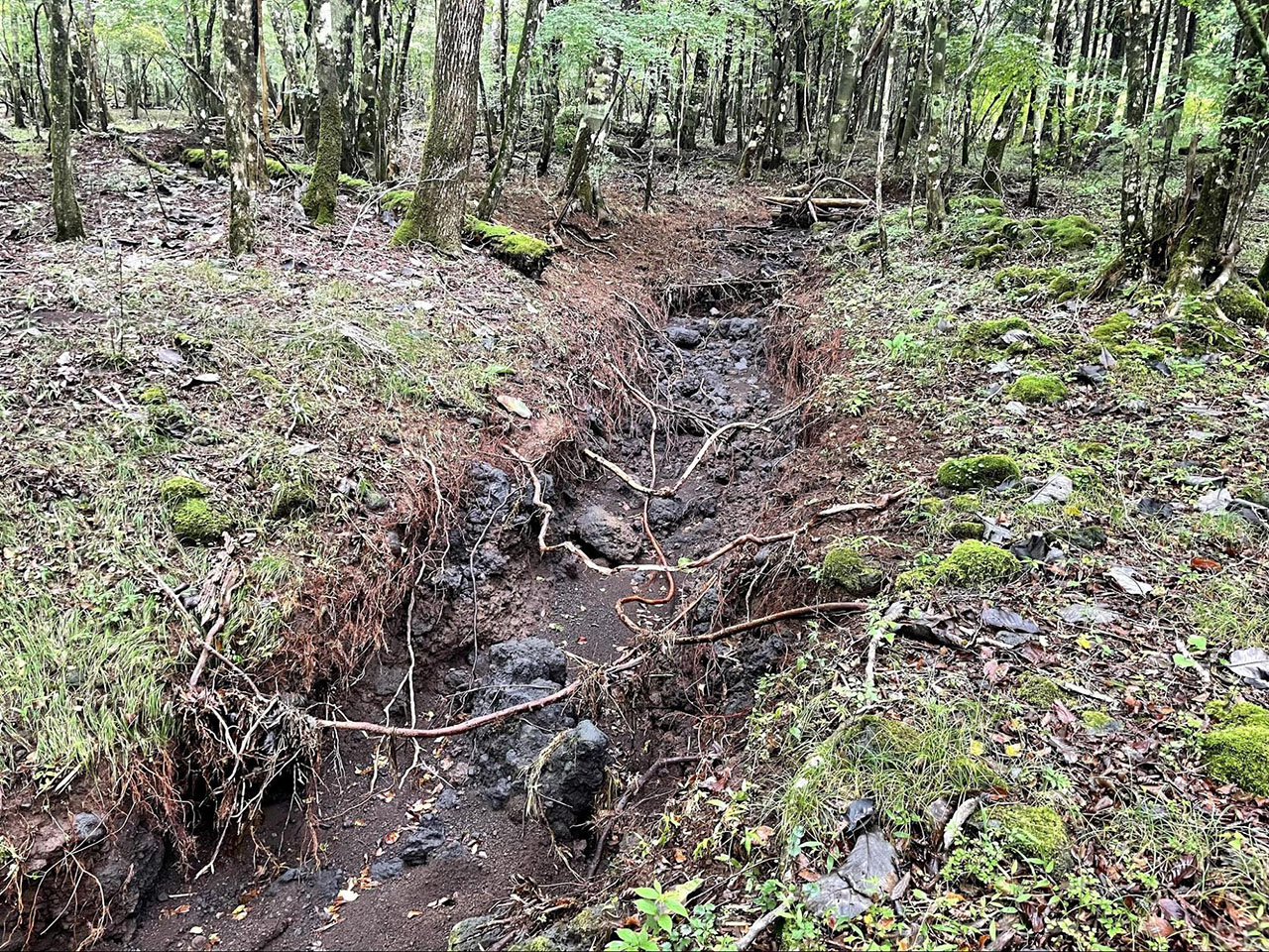 地図によると古道沿いには「富士山麓山の村」というキャンプ場があるらしく、自販機で補給ができないかと期待したが、行ってみると何の痕跡もない更地になっていた。調べると数年前に閉鎖されたという。そしてこのあたりから道は歩きにくくなっていった。えぐれた谷に残された古いリボンに幻惑され、あるいはリボンが途絶えて踏み跡すら見つけられないようなヤブに迷い、工事や崩落箇所、崖に遮られ、ここまで来てこんなに苦労するのかとロードを下りなかったことを後悔した。このルートは登山者も非常に少ないらしく、五合目からは誰にも会わなかった。