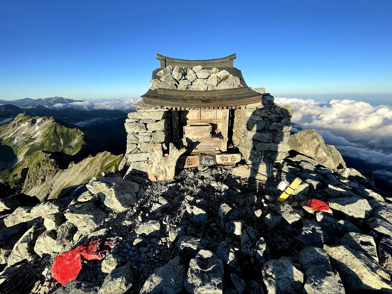 午前6時前に山頂へとたどり着いた。以前、明治時代に剱岳を初登した測量隊が、山頂で平安時代後期の錫杖を発掘したというエピソードを読んだことがあり、自分も登ったら発見現場となった石室を捜そうと思っていたのだが、景色を見ているうちに忘れてしまった。