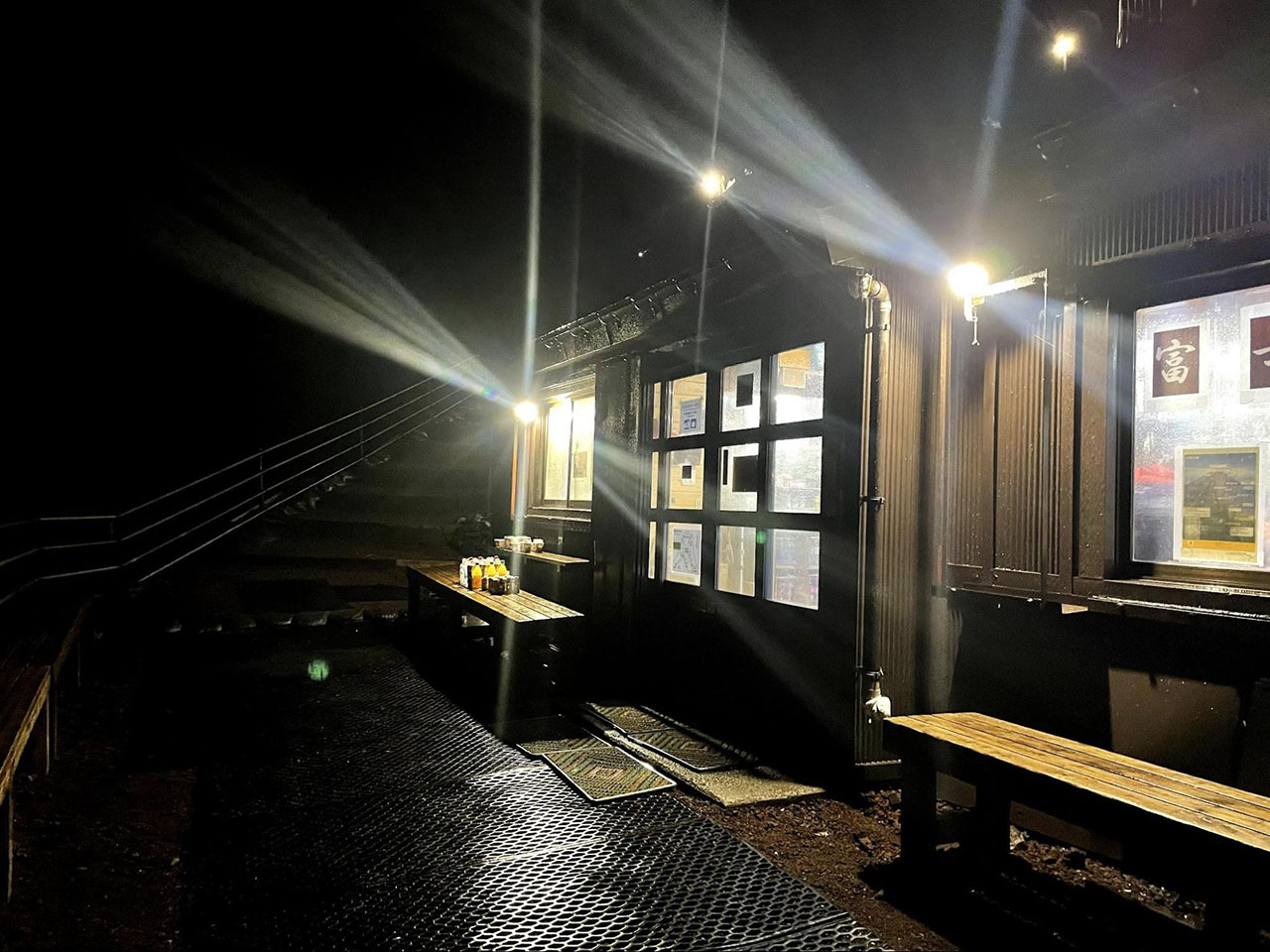 ここからは剣が峰に行って下山するだけの計画だった。この先の富士山お鉢ルートで迷うことはほぼ考えられないが、これだけ視界が悪ければ足を踏み外すこともありうる。残念だが意を決し、剣が峰はパスして最も近い下山口である富士宮口に向かうことにした。ぼんやりとトイレの灯りが見え、あわててすべり込む。強風で歩くのも厳しく、一息つきたかった。