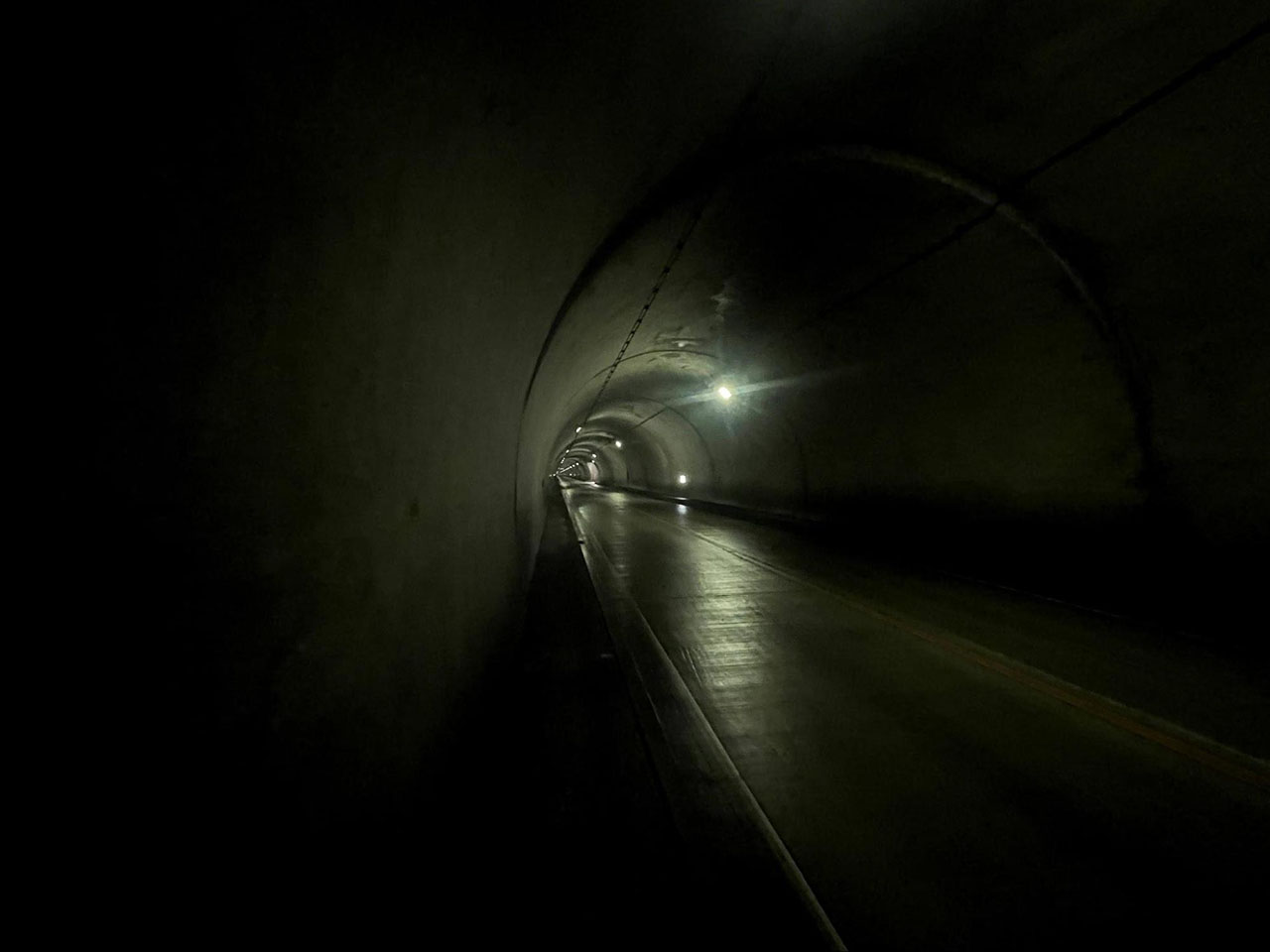 新鳥坂トンネルが現れた。このあたりが登りのピークで、500m近いトンネルを抜けると緩やかな下りとなり歩みが速くなる。再度少し登った後、若彦トンネルに入った。このトンネルは全長2.6kmもあるが下り基調で、重力の助けを借りて走り抜けることができた。