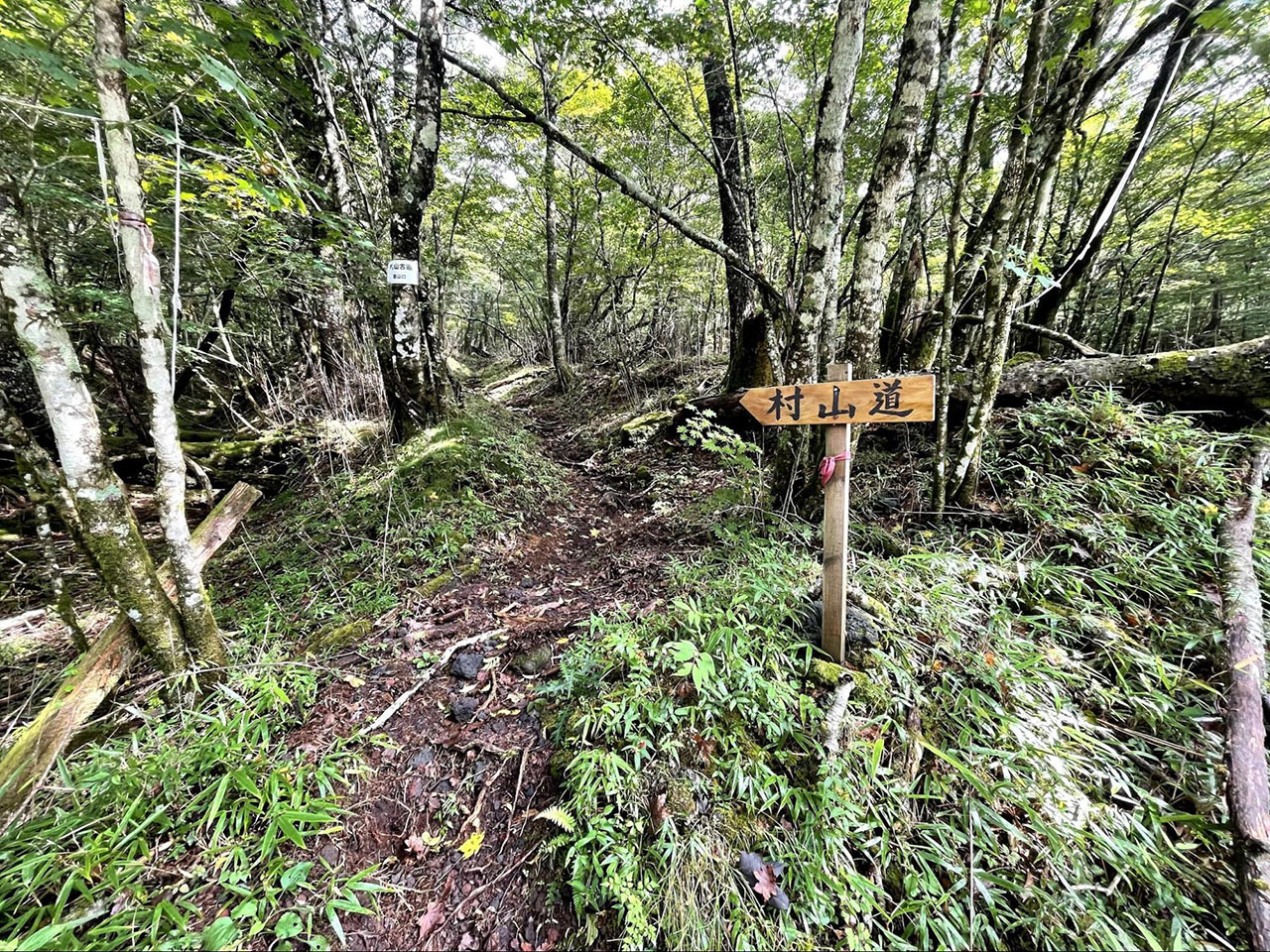 村山古道は村山浅間神社を起点とする参詣道で、山梨の吉田口に登山者が集まることで廃れていたルートが平成になって整備されたものだという。自分は本で読んだだけで足を踏み入れたのは初めてだった。当初は適度に人の手が入った痕跡があり、目印のリボンもわかりやすく、下り一辺倒で歩きやすかった。
