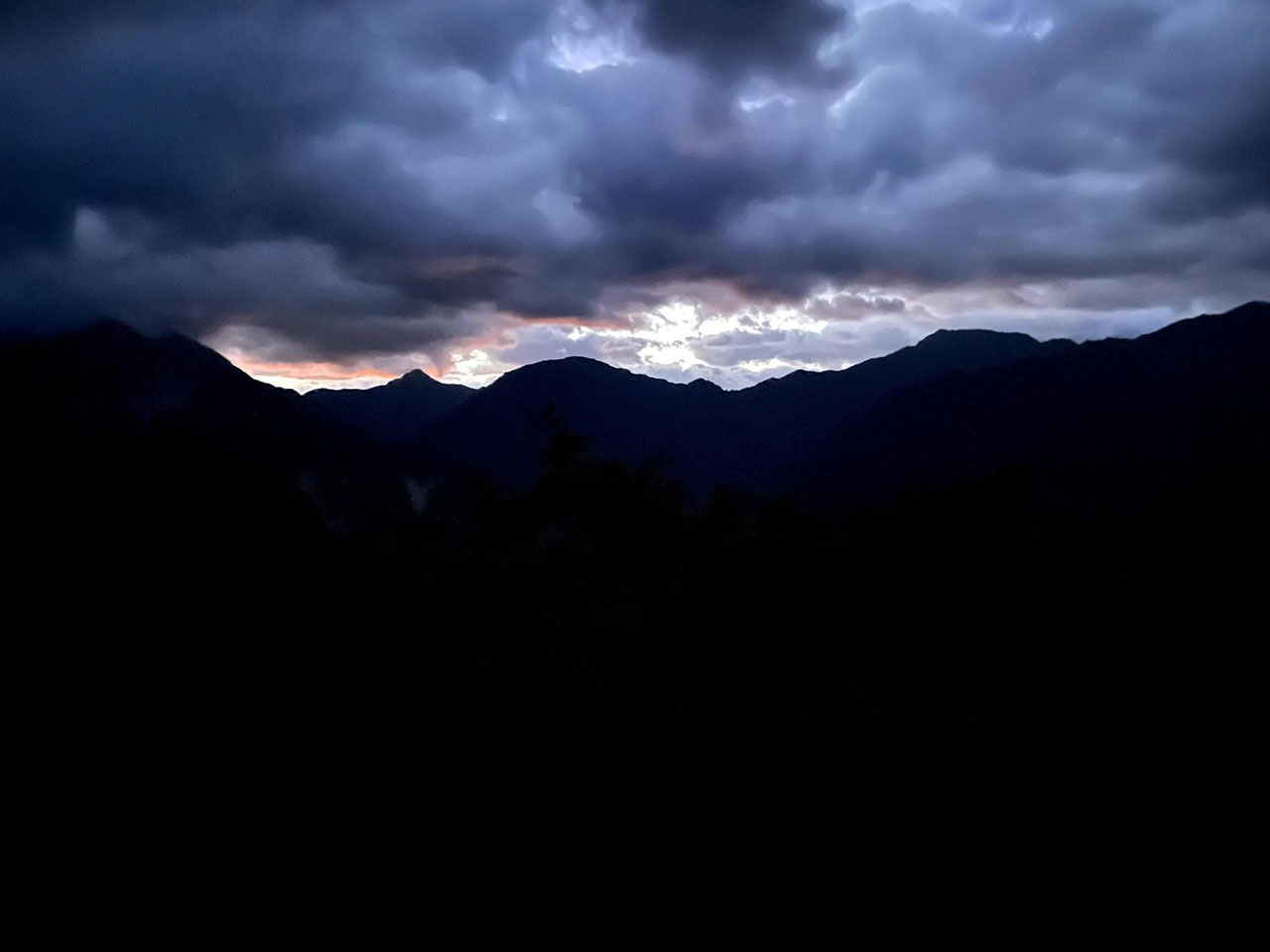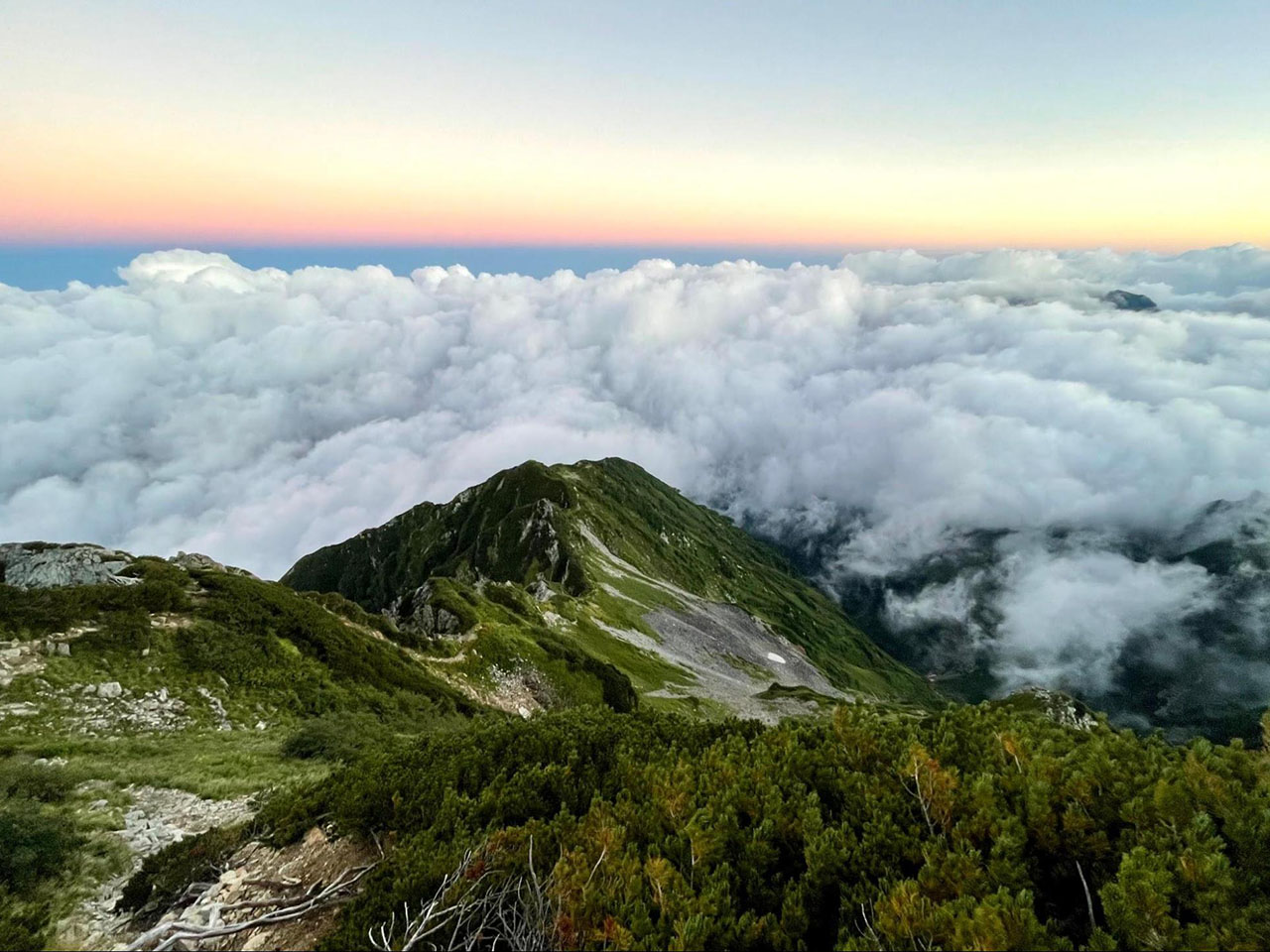 午前4時、小屋から外に出ると霧雨が晴れていた。昨日は望むべくもなかった朝焼けが見える。コーヒーを飲んで再び山頂に向け出発した。