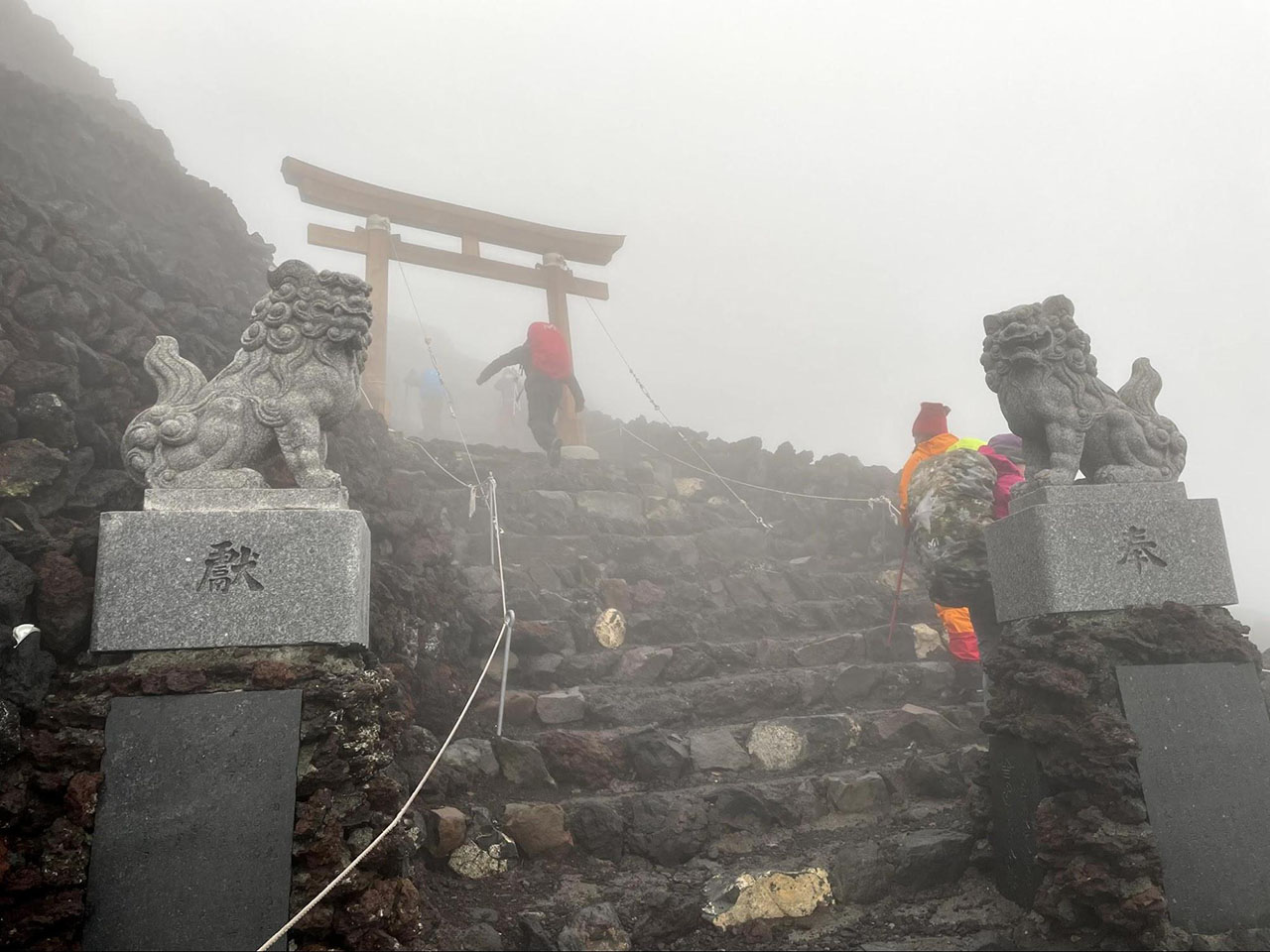七合目は標高約3000m。また700m以上登るのかと思うとうんざりするが、これが本当に最後の登りだ。天候が落ち着いたこともあり、人数は少ないもののご来光目当てのハイカーも目につく。淡々と登って久須志神社の鳥居をくぐり、山頂に到達。