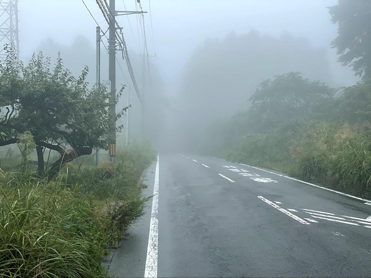市街地を抜けると徐々に人家が少なくなり、道の傾斜が強くなってきた。これから御坂山地の峠越えが待っている。標高が上がるにつれて霧が濃くなり、ときおり小雨が降り出す。クルマも滅多に通らず、誰も歩いていない。下調べでは、峠の標高は1100m程度。ふだんならなんということのない高低差だが、すぐに休憩をとってしまうためなかなか進まない。心拍数も上がらないため身体が冷え、レインウェアを着ていても足を止めると震えが来る。疲れているが、とにかく歩かなければならない。