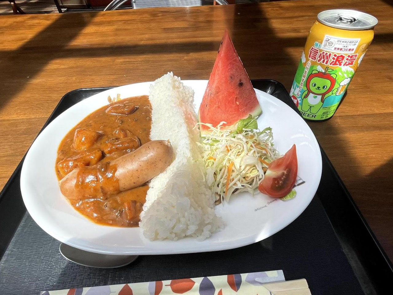 七倉山荘から信濃大町までは約16km。下り基調の硬いアスファルトが足にダメージを与えていく。大町の市街地に着いた時にはかなり消耗しており、疲労回復に悪影響があることは知りつつもついビールを買ってしまった。