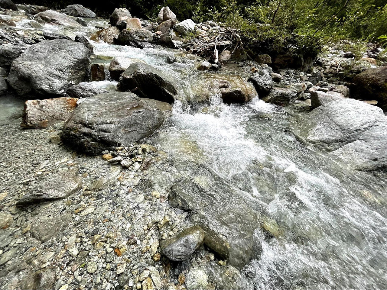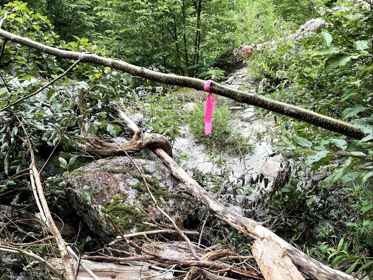 谷に入ると、当初は恐ろしげな印象に反し、意外なほどフラットで歩きやすい道が続いた。要所に目立つピンクのリボンがあり、ルートもまあまあわかりやすい。沢の対岸にピンクのリボンが現れ、いよいよ徒渉が始まる。前日に雨が降ったようで水量は多い。サンダルに履き替え、やや上流に身体を向けて沢を渡った。水はヒザの上まで押し寄せるほどで、とにかく、超冷たい! 10秒も経つと下半身から冷気が脳天まで達し、渡り終わった後に呼吸をととのえて震えを止めないといけないほどだった。前日ひねった足首をアイシングできたことだけは良かったかもしれない。