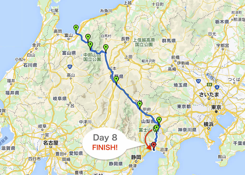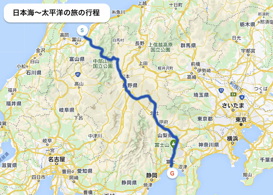 当初の計画時点では、この旅は日本海から太平洋までを、シンボリックな山々をつないで歩くことが目的であり、その途中で立ち寄る街や舗装路は、いわば私に許された日数と体力とをふまえた妥協の産物であった。しかしながら実際に歩いてみると、山はもちろんすばらしかったが、街や人里にもそれぞれの魅力があった。早月尾根のナイトハイク、剱岳と立山エリアの大展望、澄み切った称名川、霧の五色ヶ原、ファンタジーゲーム気分になれた黒部湖の渡し船、ワイルドな針ノ木谷、信濃大町の安心感、諏訪湖のエイド感、街道沿いの宿場町、河口湖のゴール感、富士山頂の暴風、富士宮口から見えた太平洋、どれも忘れられない。しかし最も印象に残ったのは、特定の景色や目的地以上に、場所と場所とをつないでいる連続した「道」そのものだった。