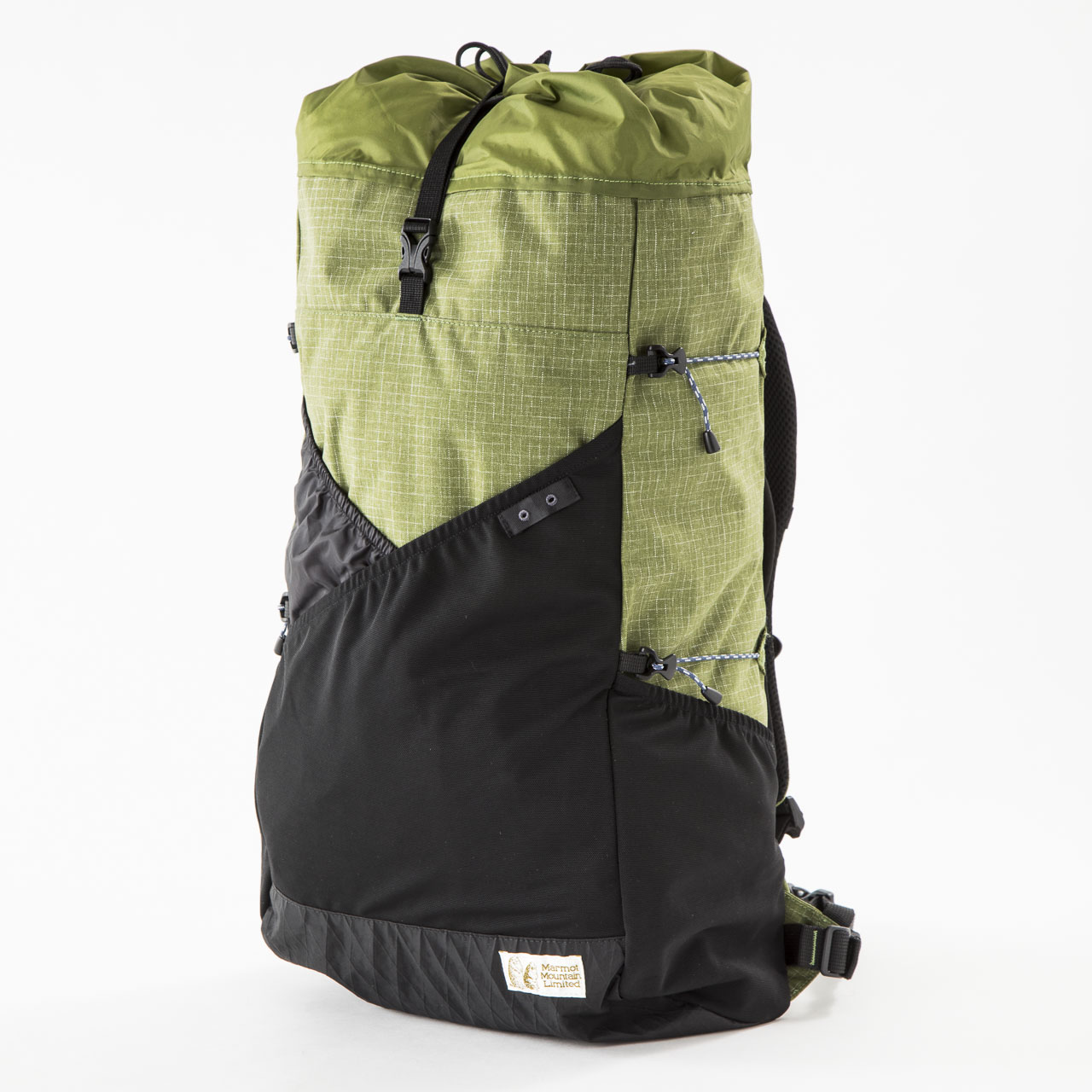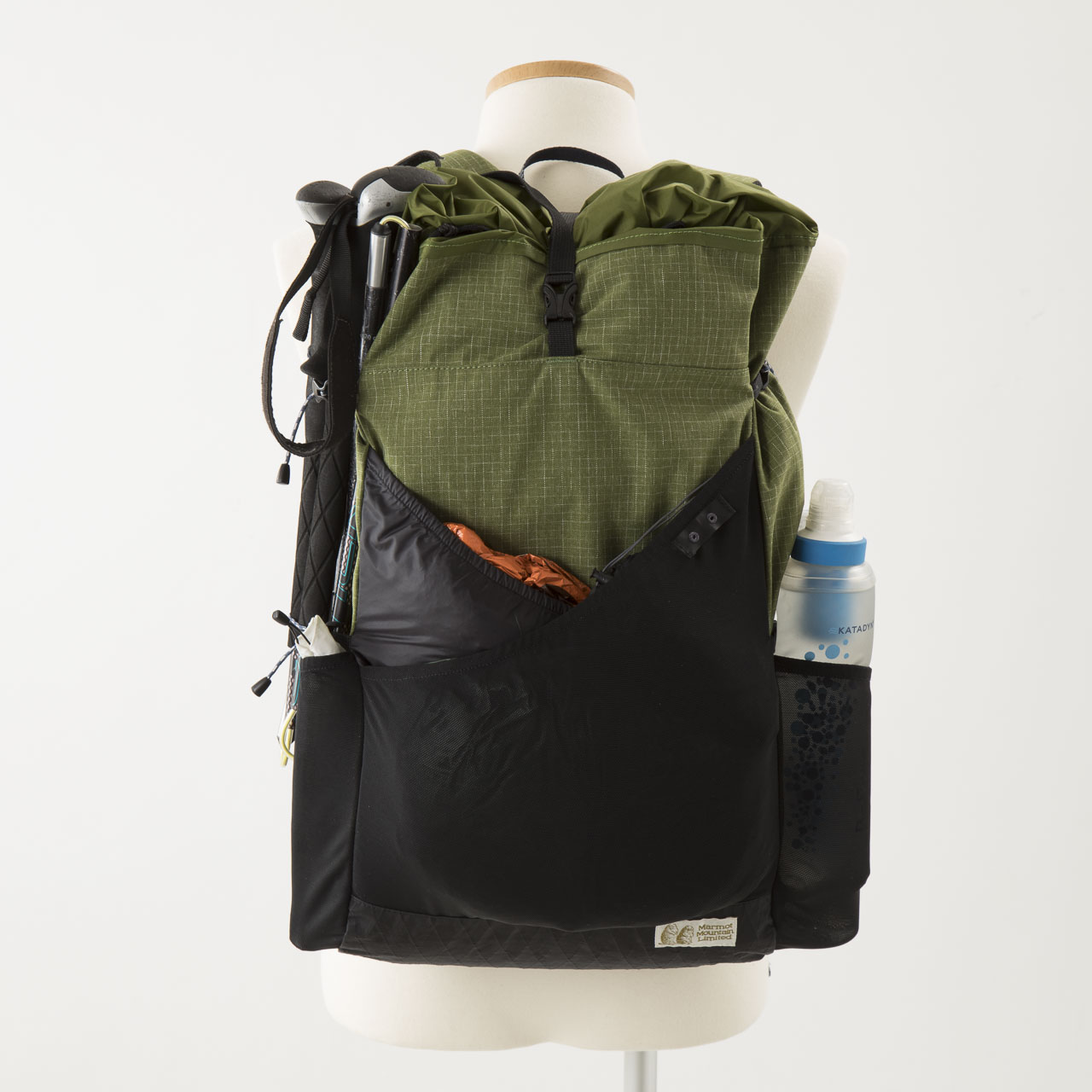 土屋氏コラボのReEX35に続いて、同じくマーモットからあの山スカートの伝道師、四角友里氏とのコラボレーションラインのバックパックです。見た目がまんまレイウェイというところに日本のULカルチャーも思えば遠くまで来たものだと感じさせますね。コンプレッションにナイロンテープではなくロープが使われていたり、スパイダロンという杢の入った生地が使われていたり、山バッジをつける場所が設けられていたり、内部に小物ポケットがついていたり、随所に女性らしいアイデアが盛り込まれていますが、重量も525gと立派にULです。