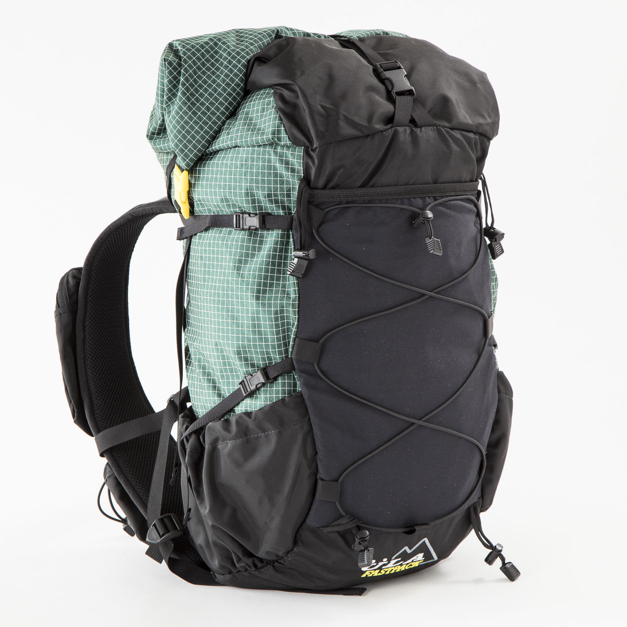ウルトラツアー40に続いて同コンセプトのバックパックをもうひとつご紹介します。その名も「ファストパック」は、ULA初のベスト形ショルダーストラップを搭載したバックパック。バックパック本体のデザインはコンジット、サーキット、CDT、フォトンと同型のロールトップのULAの定番形で、サイズ的にはCDTより短く、幅を広くしたような形でフロントポケット前にはバンジーコードが着いています。フロントポケットはライクラ素材で、サイドポケットは厚手のナイロン素材。ショルダーストラップにもボトルホルダーとファスナー着きポケットが左右ふたつづつあり、ポール/アックスホルダーやコンプレッションストラップも完備。メインコンパートメント内部には取り外し可能な小物用ポケットとハイドレーションポケットが付属しています。