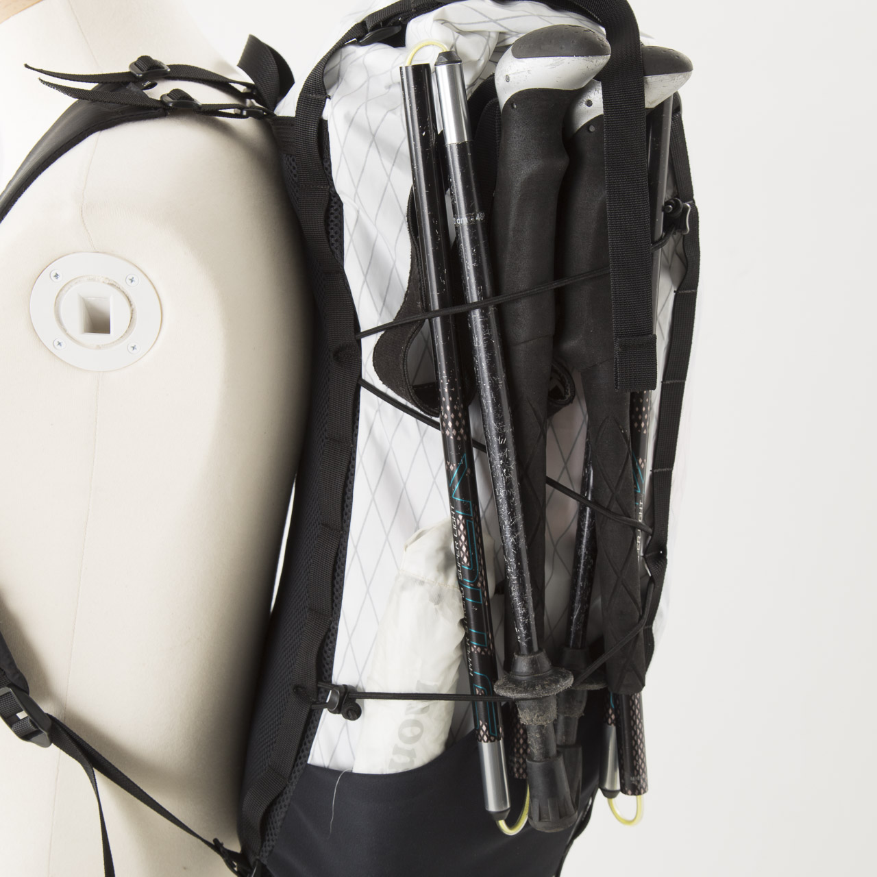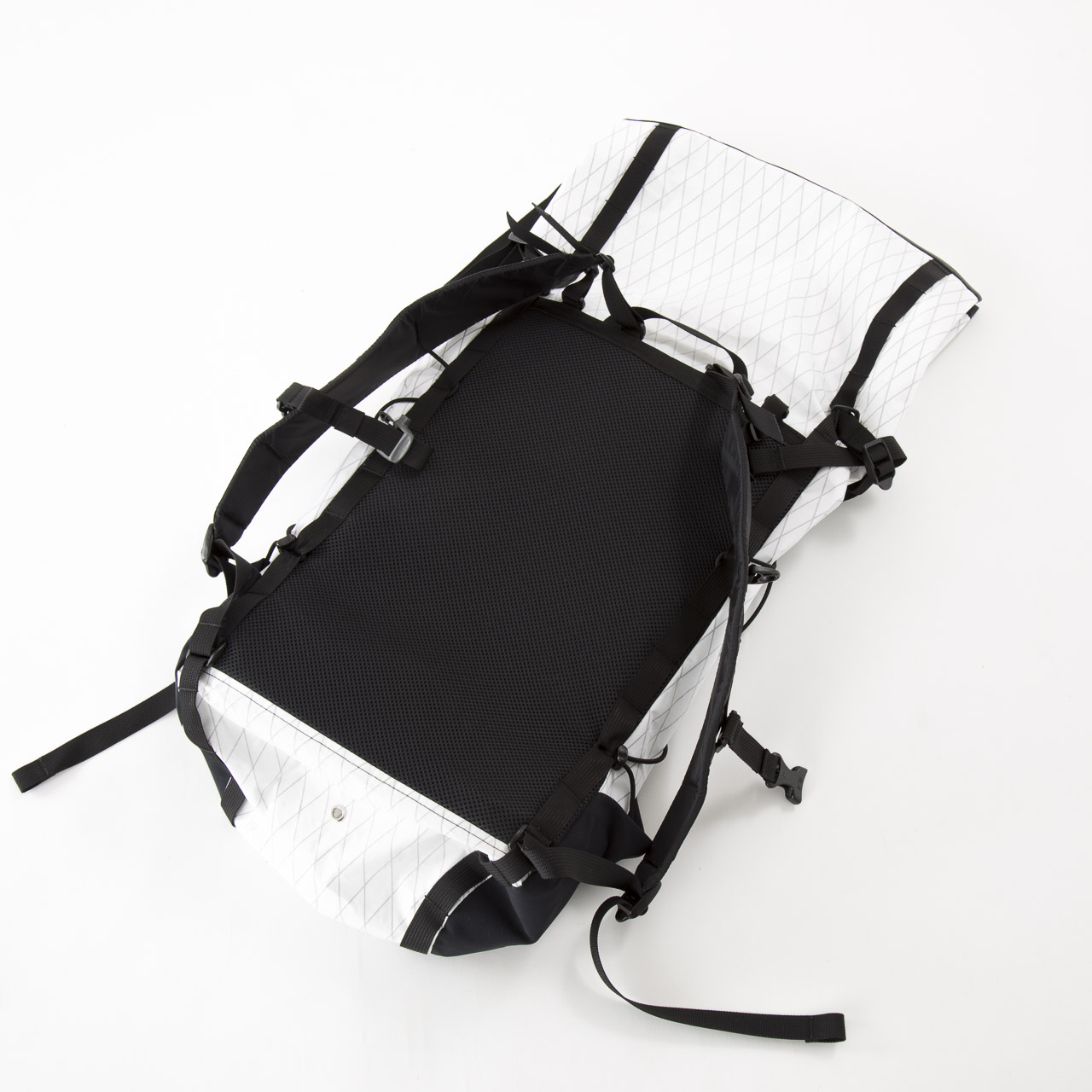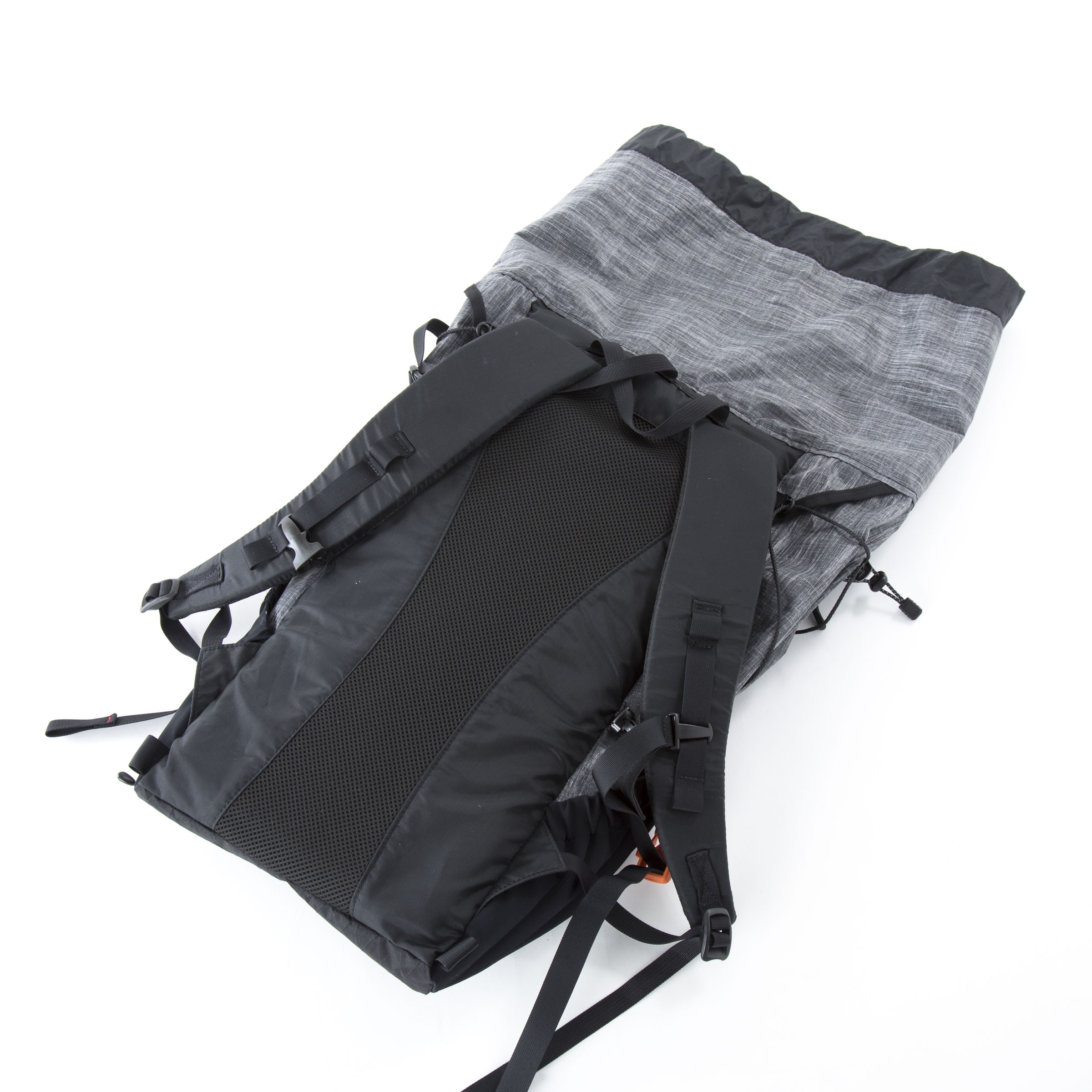 重量380g+装備重量6070g=計6.45kgのパックウェイトでテストしてみました。背面は薄手のパッド+メッシュという現在のスタンダードなULバックパックの作りです。アクペリエンスの標準使用であるシンプルライトハーネスは、その名の通り非常に軽くシンプルで、手で持つと少々心許なさを感じましたが、背中の中心に重心が来ることを意識しているという荷重バランスのせいか、その薄さに比して背負い心地は良好でした。ただ、オプションで用意されているさらに保持力に優れたADCスタンダードハーネスやベスト形のADCアクティビストハーネスも試してみたいとも思いました。