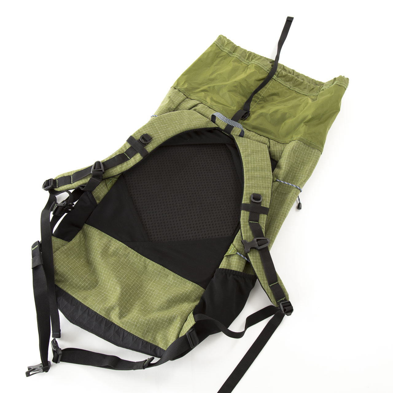 背面はメッシュ素材に薄いパッドが入っていて、ヒップベルトはなし。そしてこのバックパックの最大の特徴はベスト形のショルダーストラップなのですが、かなり幅広で基部が2点式で、スターナムストラップもかなり下方に付いています。45Lの大容量をヒップベルトなしで支えるように作っているので、ULA的にはかなり自信を持った設計なのではないかと思うのですが、肝心の背負い心地は正直クエスチョンマークでした。