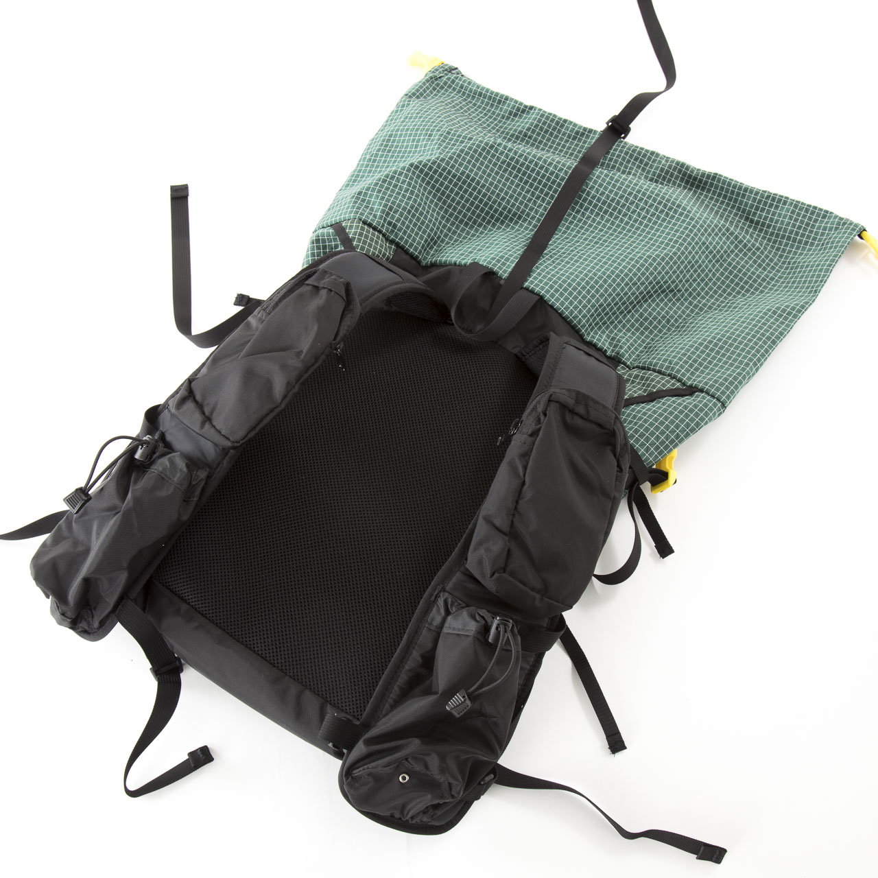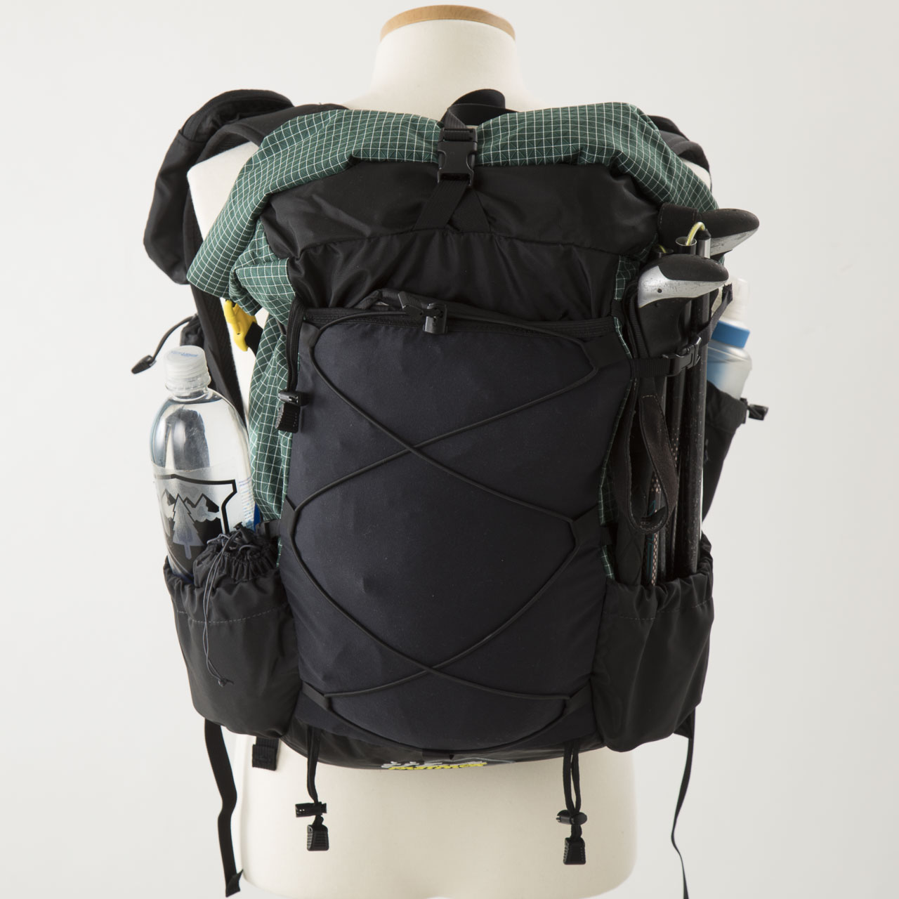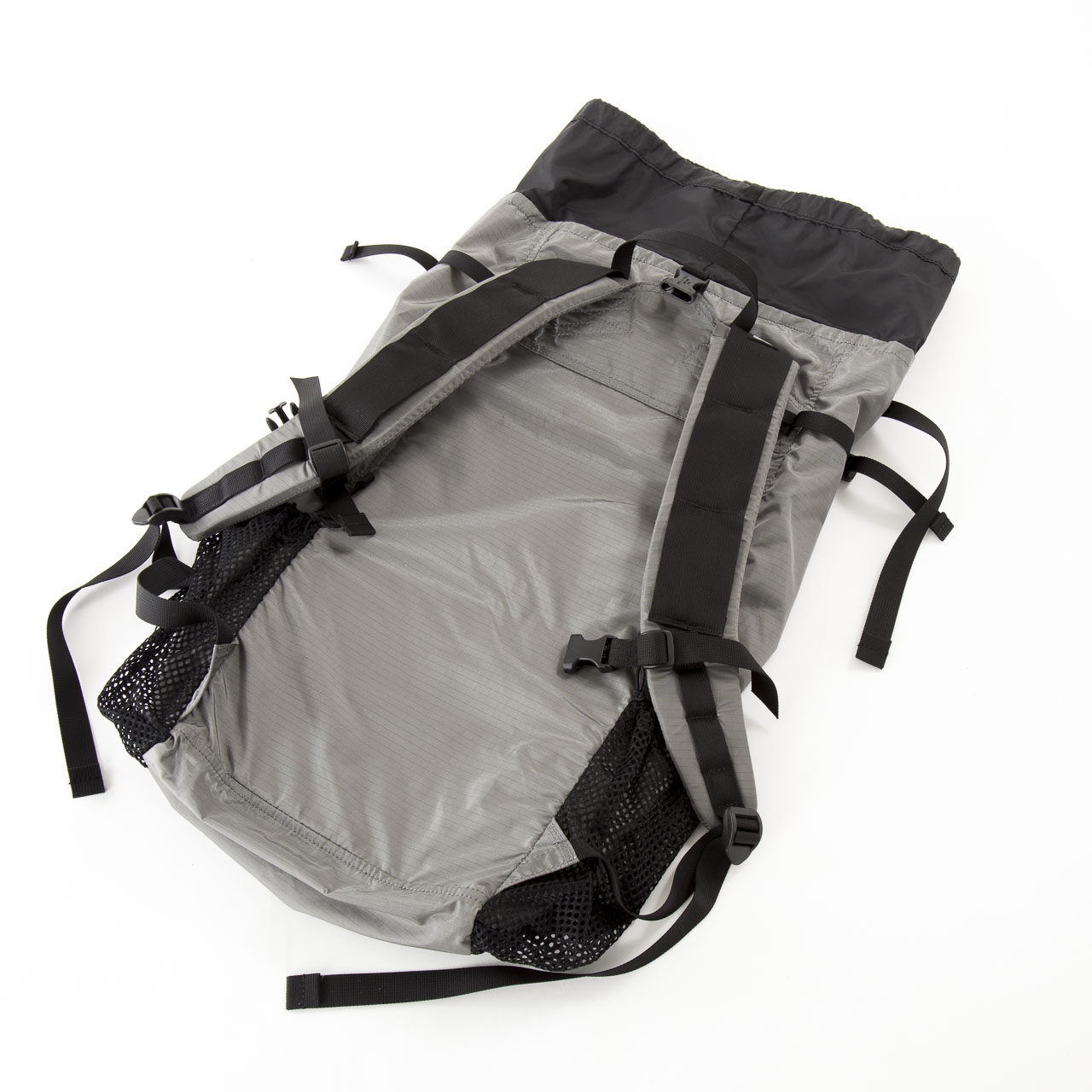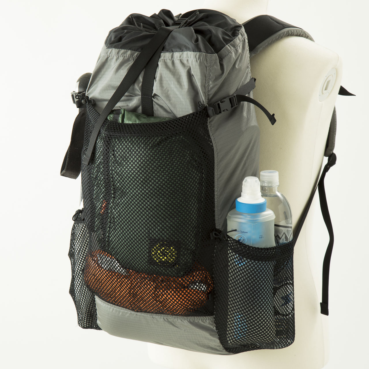 本体生地の30デニールバリスティック・ナイロン・リップストップは今回集めたバックパックの中でももっとも軽量で薄い素材を採用し、雨蓋はあるものの、フロント&サイドポケットを備えたその外観はモンベルからのULバックパックへの回答とも言えるのではないでしょうか