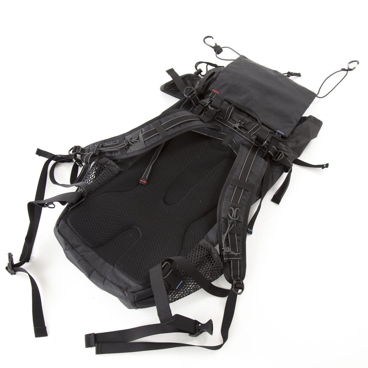 今回いろいろなバックパックに触ってみて改めて感じたのは、山と道のバックパックは「全部乗せ」だということ。フロント&サイドポケット、バンジーコード、ストラップ、背面メッシュと取り外して使用できるパッドなど考えうるULバックパックのオプションが全部乗っているのですが、他社の同クラスのバックパックはそのどれかをオミットしていることが多いのです。実際、自分が使っているKS30も容量的にはほぼ同じですが、スリーピングパッドやトレッキングポールなどの外付けのしやすさと自由度はミニの方が格段に優れています。