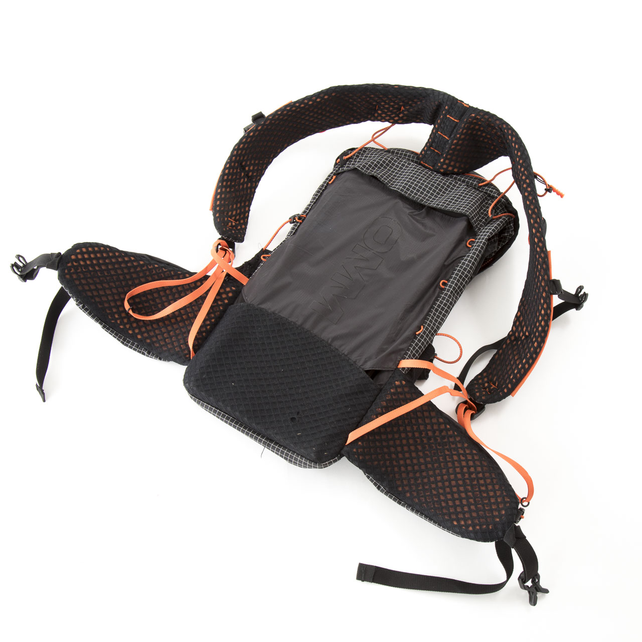 本体重量565g+装備重量6070g=計6.6kgのパックウェイトでテストしてみました。背面には腰部にのみメッシュが入り、OMMのバックパックの多くの背面に搭載されているデュオマット(130g)が内蔵され、さらにフレームも入っています。