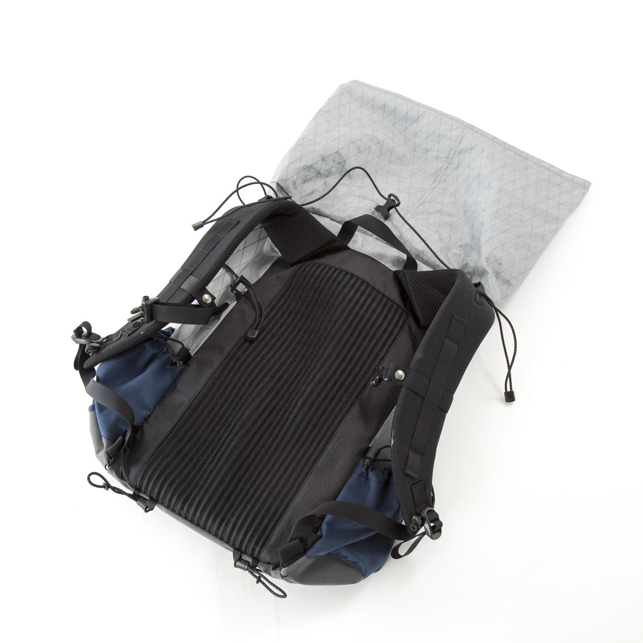 中央のキューベンファイバーのスタッフサックの中にはダウン製品一式(ハイランドデザインのサブSキルトとウエスタンマウンテニアリングのフラッシュフーディ)が入っています。
