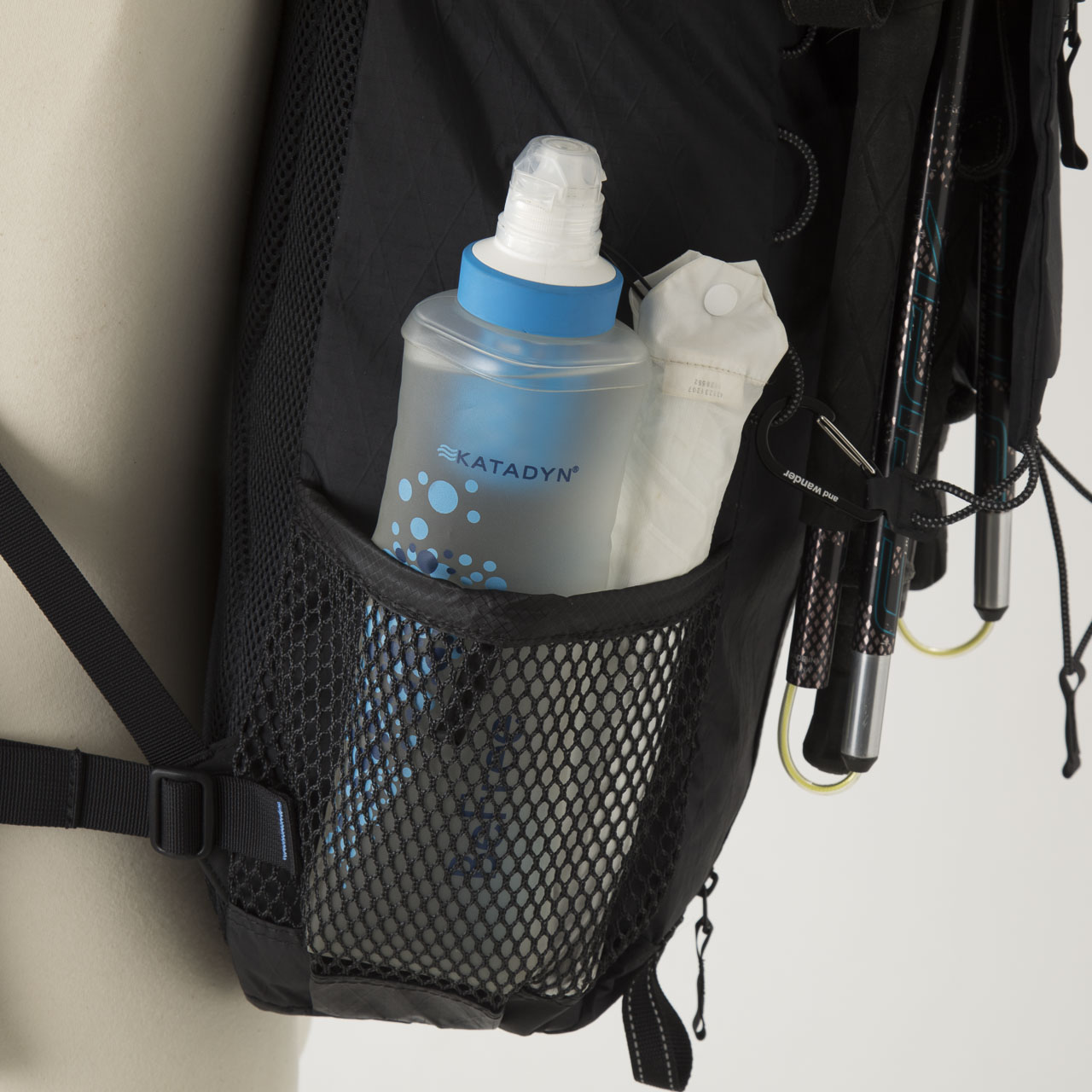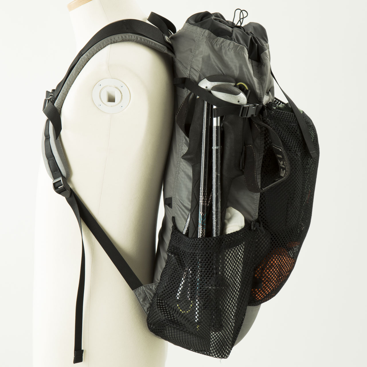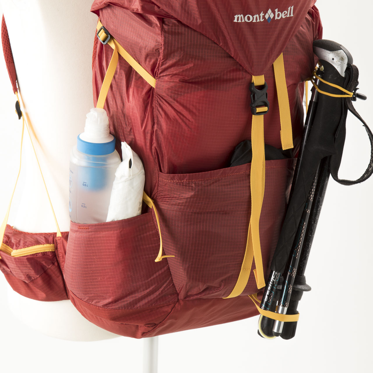 ただ、サイドメッシュポケットは容量が絶妙に小さく(1Lナルゲンボトルが入らない大きさ)、ハードメッシュで伸縮もしないので、モノの出し入れがし難いです。本体前面上部にふたつ並んで付けられたポールホルダーも個性的で素晴らしいデザインですが、近年主流の3つ折りポールに対応していない点が惜しい。このポールホルダーに連携する形でかなり上に取り付けられたコンプレッションストラップの位置も謎で、これでは高すぎてあまりコンプレッション効果がないのでは?