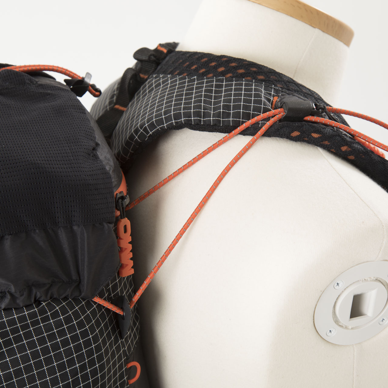 重量590g+装備重量6070g=計6.66kgのパックウェイトでテストしてみました。ハグの最大の特徴はなんと言ってもその背負い心地でしょう。まず目につくのが、後で紹介するOMMのファントムにも似た構造の脇下のフィットコード。ただ目指すところは違っていて、ハグの場合はとにかくフィット感を向上させ荷物が揺れたり振れたりすることを防ぐためのもののようです。また、トップのクロージャーとショルダーストラップを兼ねたバンジーコードも面白い構造です。とにかく体とバックパックを一体化させることに並々ならぬ情熱を注いでいることが見受けられますね。