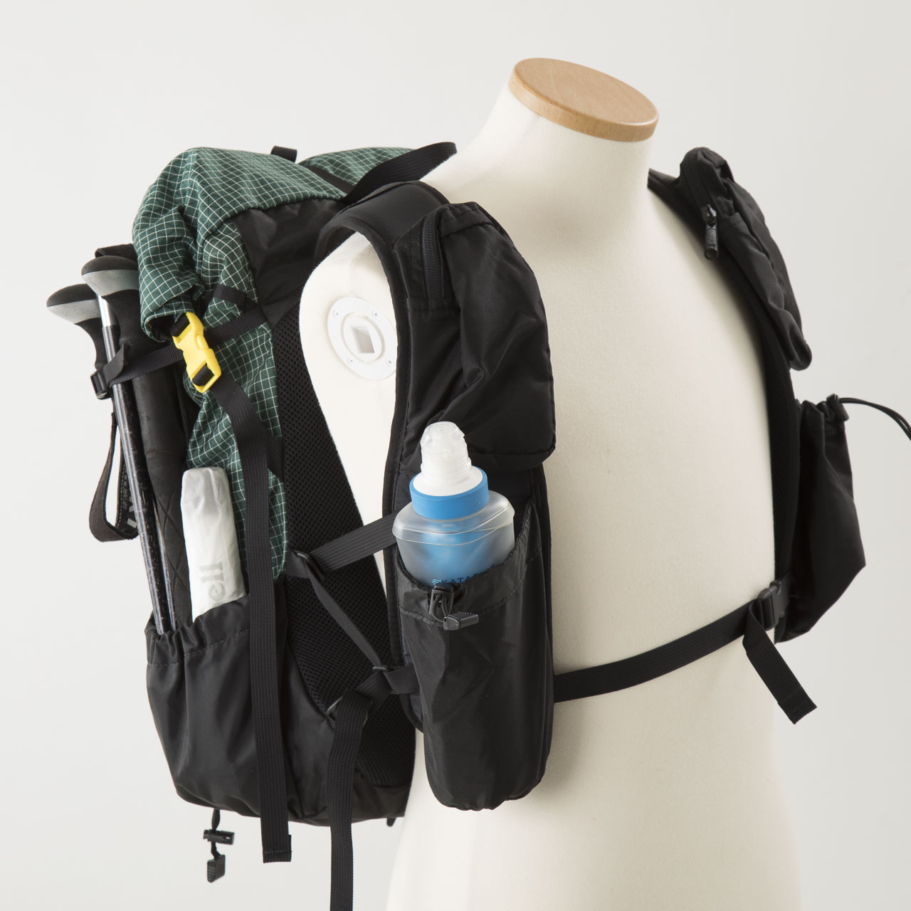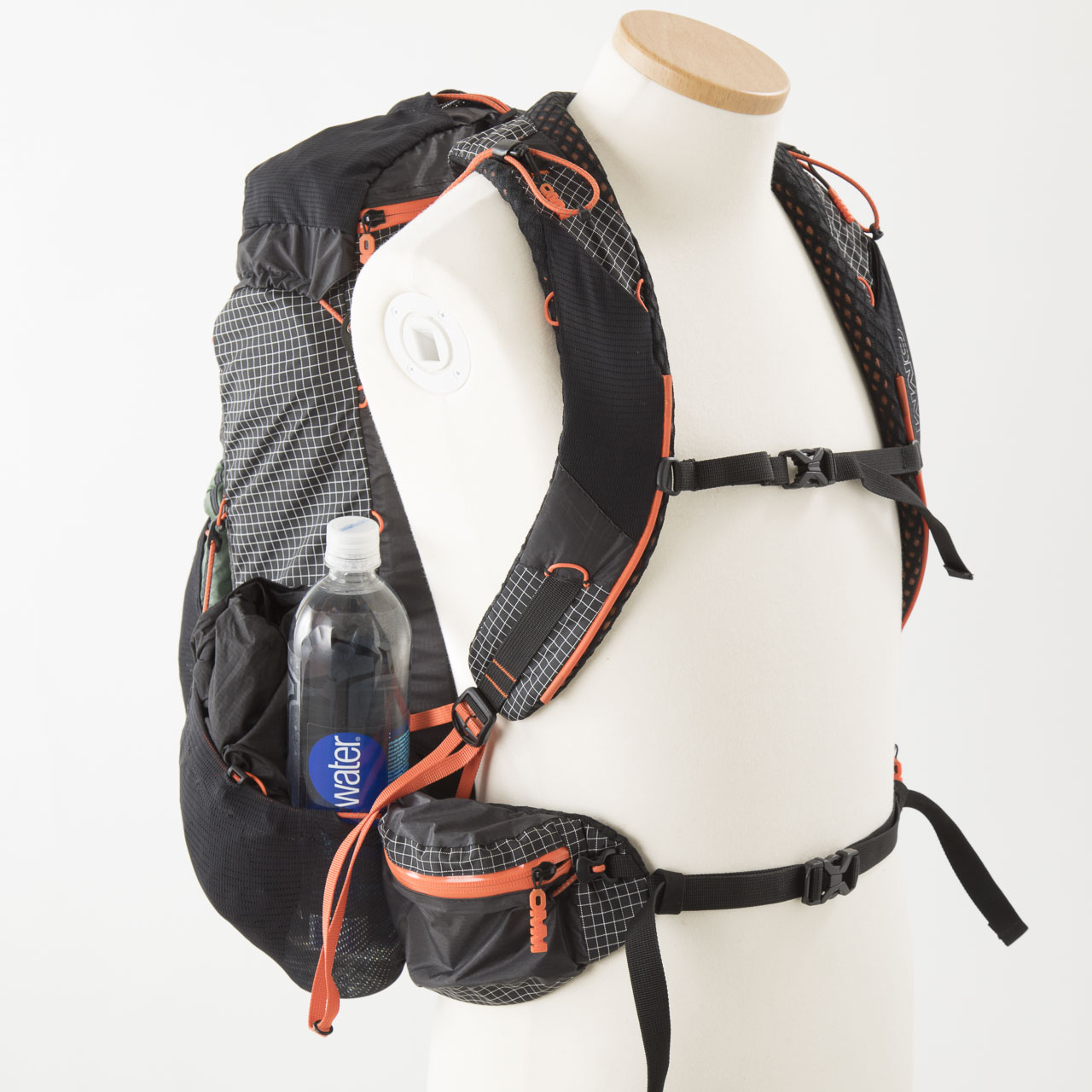 雨蓋も小さい割に三つの機室があり、ジェルや行動食などを効果的に収納できます。コンセプトと容量からするとショルダーストラップにボトルホルダーを設けた方が良かったのではないかとも思いますが、後述するこのバックパック独特の荷重バランス構造のため、あえてオミットしたのかもしれません。