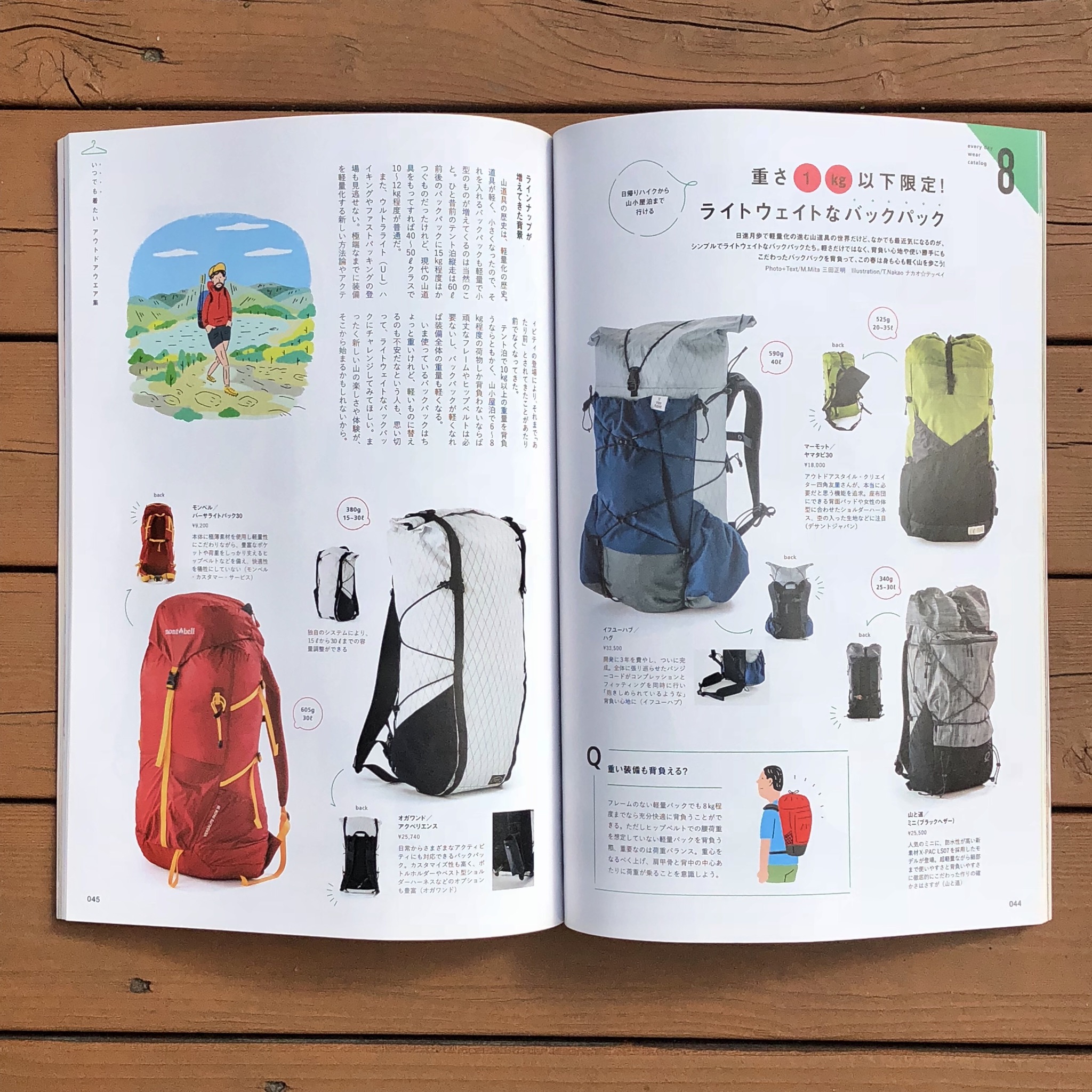 実は私、フリーランスのライター/フォトグラファーでもありまして、雑誌やウェブなどの他媒体でも記事を作成しています。そんな中、エイ出版社の雑誌『ランドネ』2018年4月号においても『重さ1k以下限定! ライトウェイトなバックパック』という特集の撮影と執筆を担当したのですが、実はここで現在日本のマーケットで入手可能な1kg以下の軽量バックパック13種類が、撮影のために我が家に集合するという事態が発生しました。