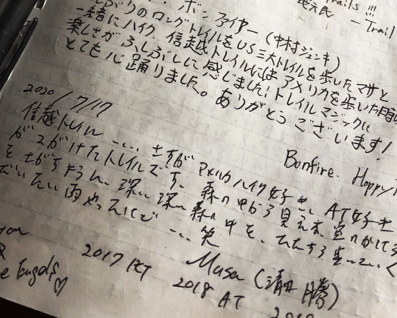 Bonfireとは彼のハイカーネームだ。そういえば去年信越トレイルを歩いた時、アメリカのトレイルの話をよくしていた気がする。パシフィッククレストトレイルを歩いた経験を共有しながらも、彼の会話の中には、いつかはふたたび3大トレイルを歩きたいという思いを感じた。