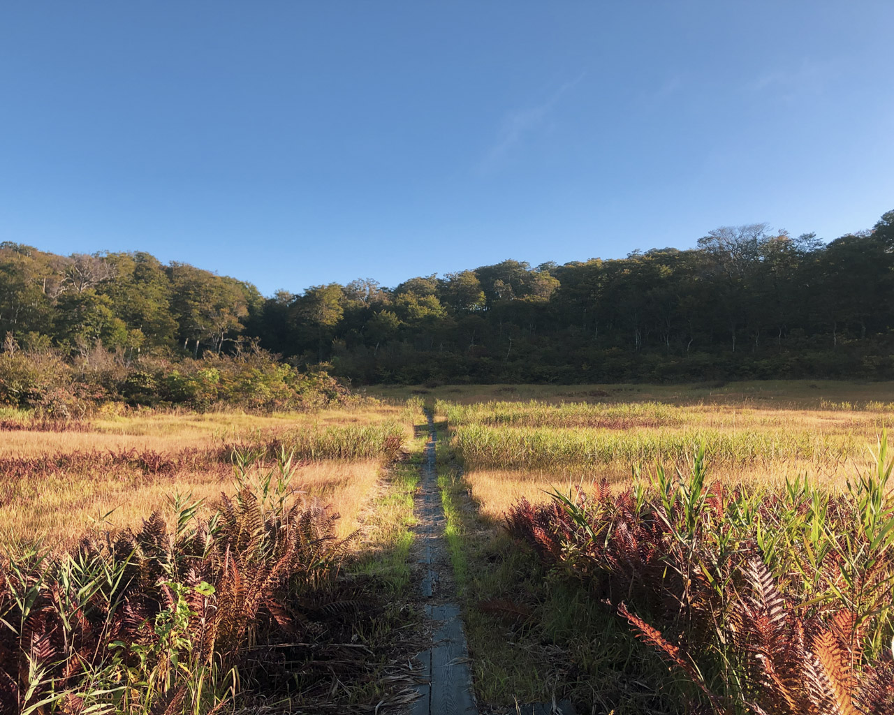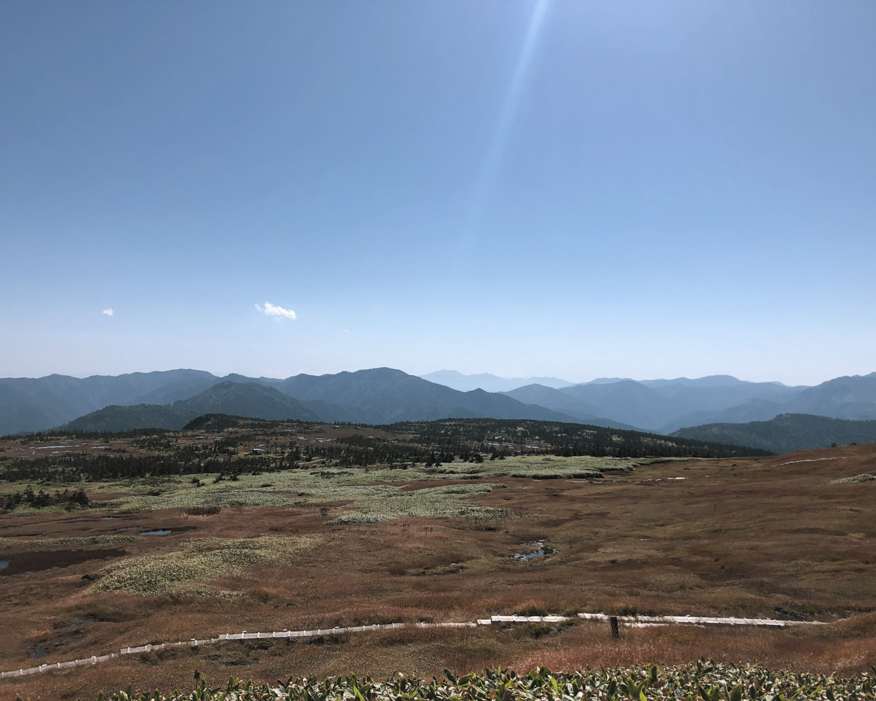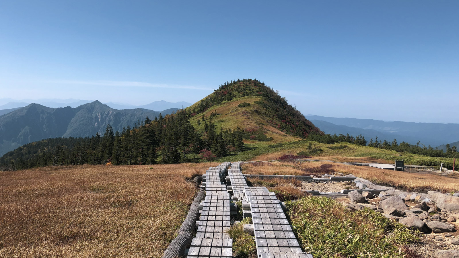8合目まで登りきると、傾斜は緩やかになり木道が続く。この一帯は上信越高原国立公園に属していて、山頂付近は湿地が広がっている。こんなに美しい景色の中を歩くと、どうしても歩くペースが遅くなってしまう。ついつい立ち止まってしまう景色がそこにはあった。