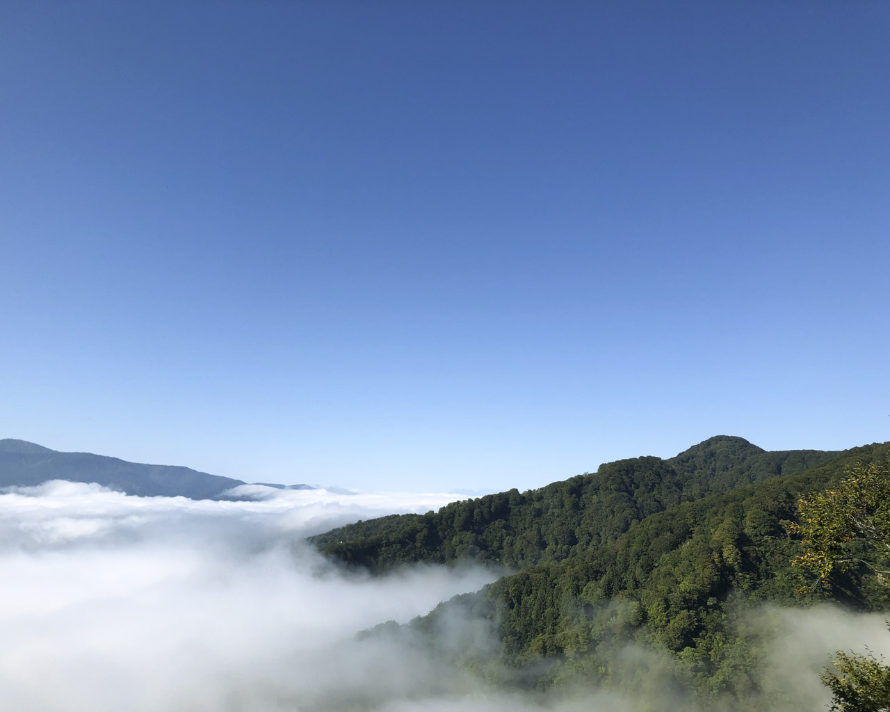 天水山からの下山が本格的に始まると展望が開け始めた。ここまで歩き続けてきた関田山脈の一部が見え、麓には雲海が広がっていた。昨夜の雨で水蒸気を含む空気がたまり、雲ひとつない快晴の朝に気温が上がり雲海が出たのだろう。