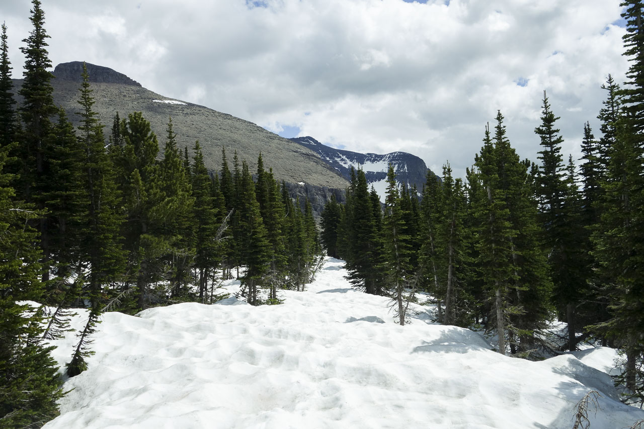 グレーシャー国立公園の山々は岩がむき出しで荒々しい印象を受ける。目を凝らして見ると岩はいくつもの細かい層が積み重なっていて、そのコントラストが美しい。谷底に小さく佇む湖は宝石のような深い青色をしていてキラキラと光っている。心配していた残雪もかなり溶けているようだが、それでもトレイル上にはまだかなりの雪が残っており、雪がない箇所を歩けたらどんなに楽だろうか、と幾度となく考えた。