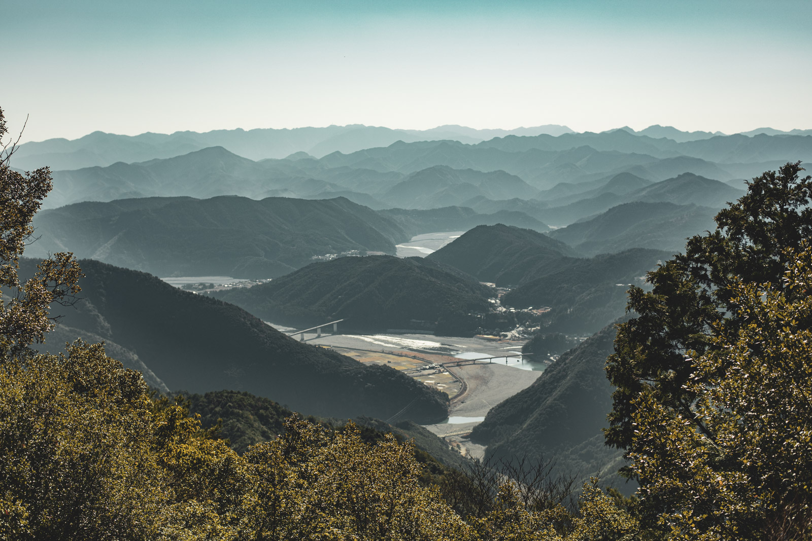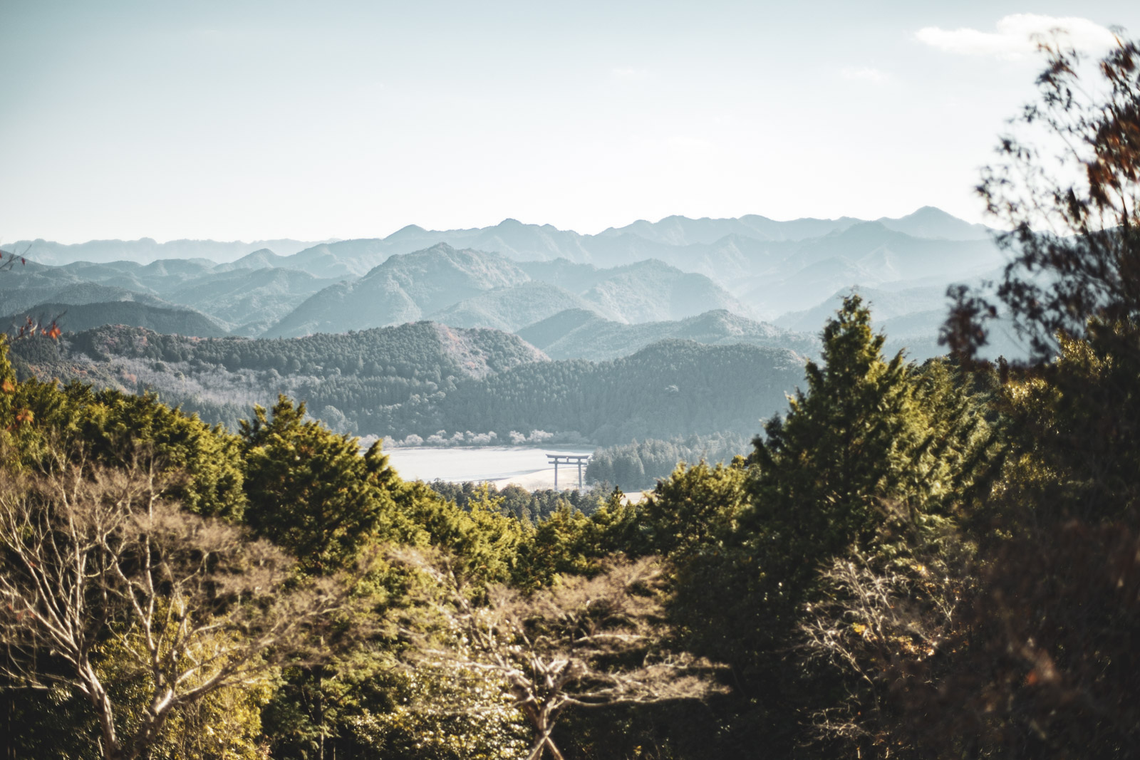 果無峠を越えて展望台に登ると、どこまでも連なる紀伊山地の山なみと熊野川、そして熊野本宮のある一帯が見渡せた。熊野川の蛇行が作った広い峡谷になっている一帯は、それまで深く狭い谷ばかりだった紀伊山地においては珍しい眺めで、この地に本宮がある理由がわかった気がした。