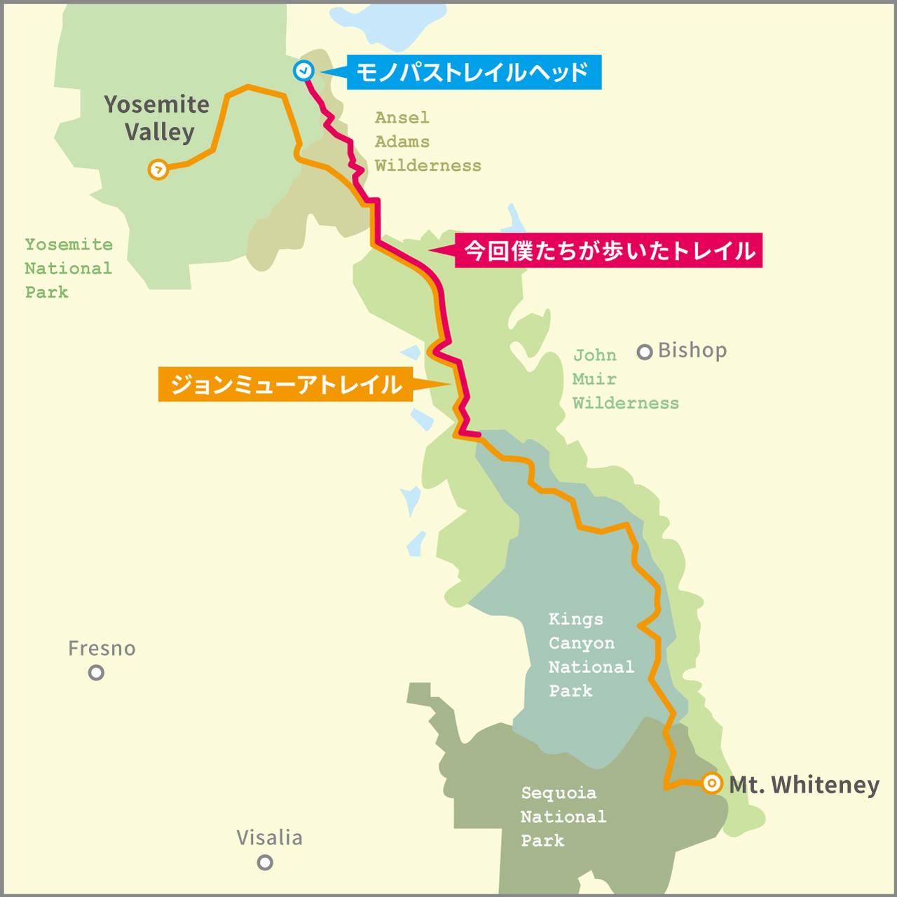 ヨセミテからの正規ルート(オレンジ色で示したルート)はパーミット所得が困難だったため(前回参照)、モノパスから歩き始めた。