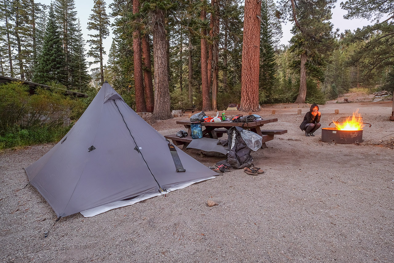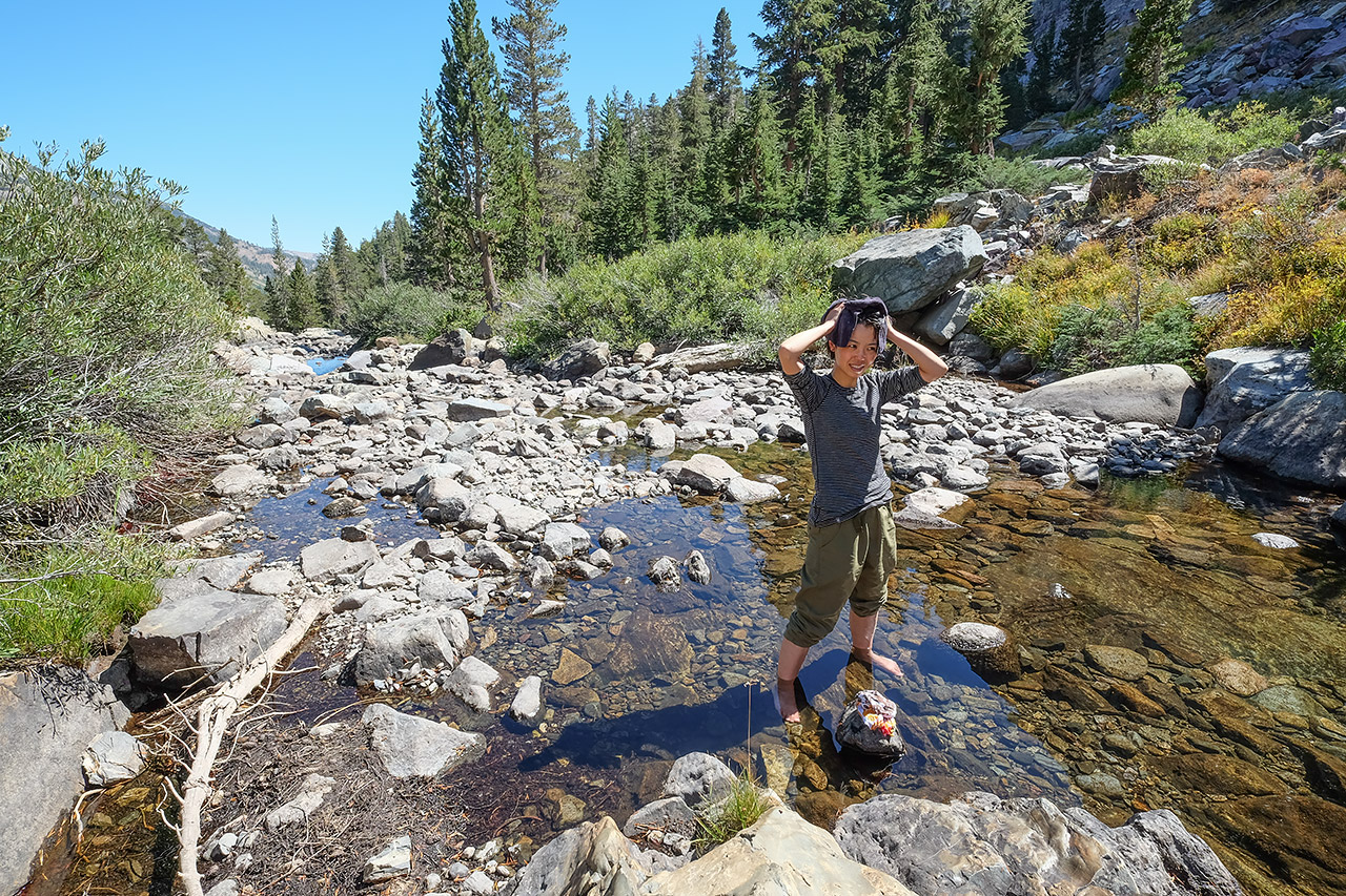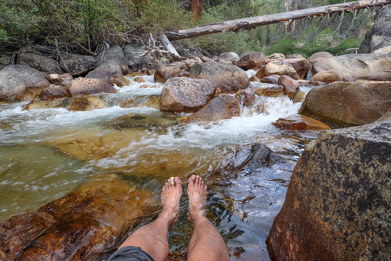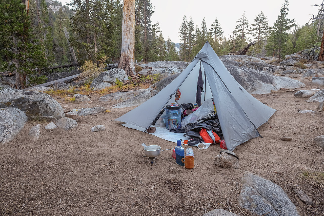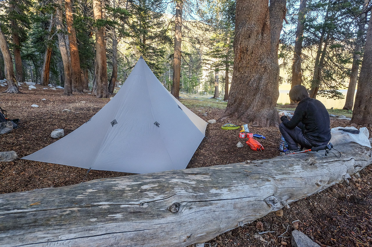 この日のキャンプサイトは初の渓流沿いだった。テントを設営し終わると同時にJMTに来て初めての雨が降ったけど、30分ほどの通り雨だった。