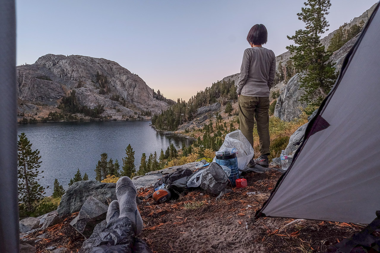 2日目のキャンプサイトのガーネット・レイクの湖畔。ここはもうJMTに合流していて、JMTでの初めての夜を過ごした。