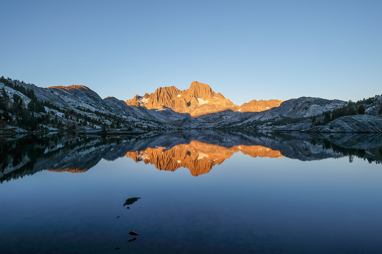 朝、キャンプサイトのガーネット・レイク奥のMt.バナーに朝日が当たる。スタートからここまで歩いてきたルートでも度々あったのだけれど、景色がダイナミック過ぎて、自分が本当にこの場所に居るのかよくわからなくなるような、不思議な感覚になる。荘厳な景色をしばらく眺めながらホットコーヒーを飲んだ。
