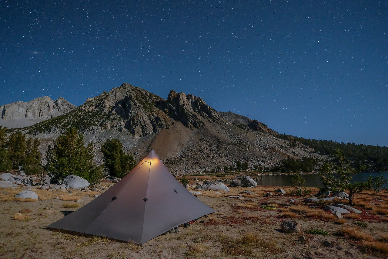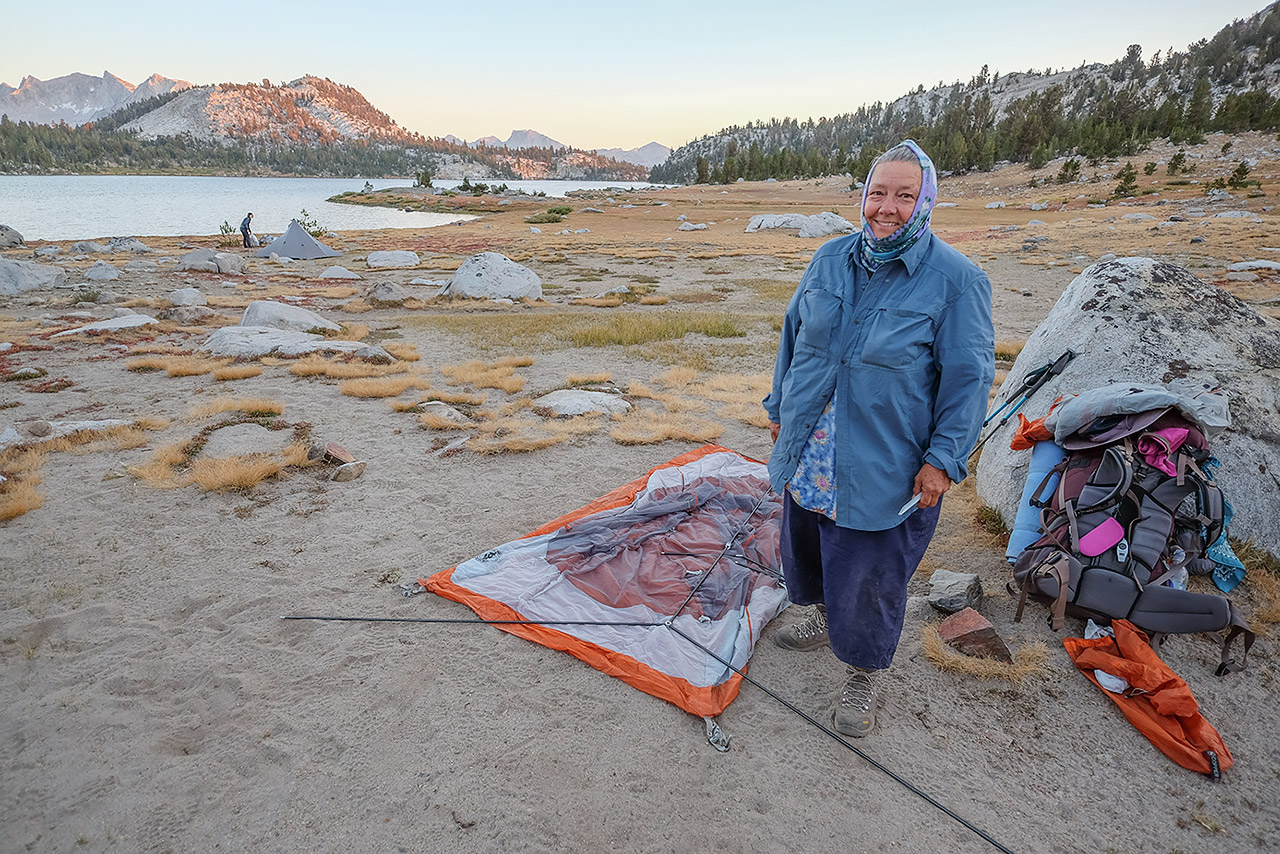 僕らが夕食を済ませてのんびりしていると、大きなザックを担いだおばあちゃんがやって来て、「そばに張ってもいいかしら?」と声を掛けてくれた。可愛い格好のおばあちゃんで、僕らのテントやザックに興味津々で、話を聞くと、42日間掛けてひとりでJMTを旅しているのだという。「あなたは何故JMTを歩いているの?」と質問されたけど、僕はうまく答えることができなかった。