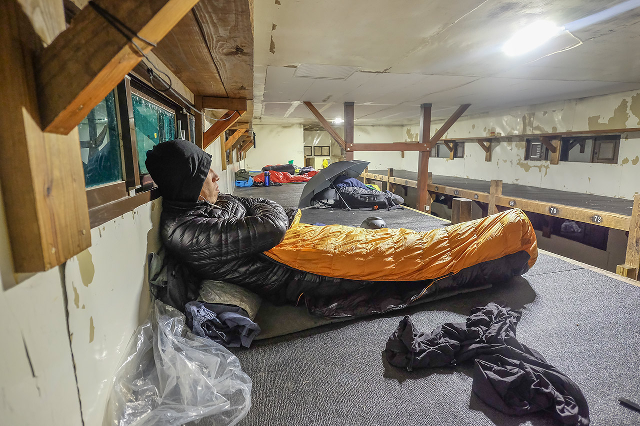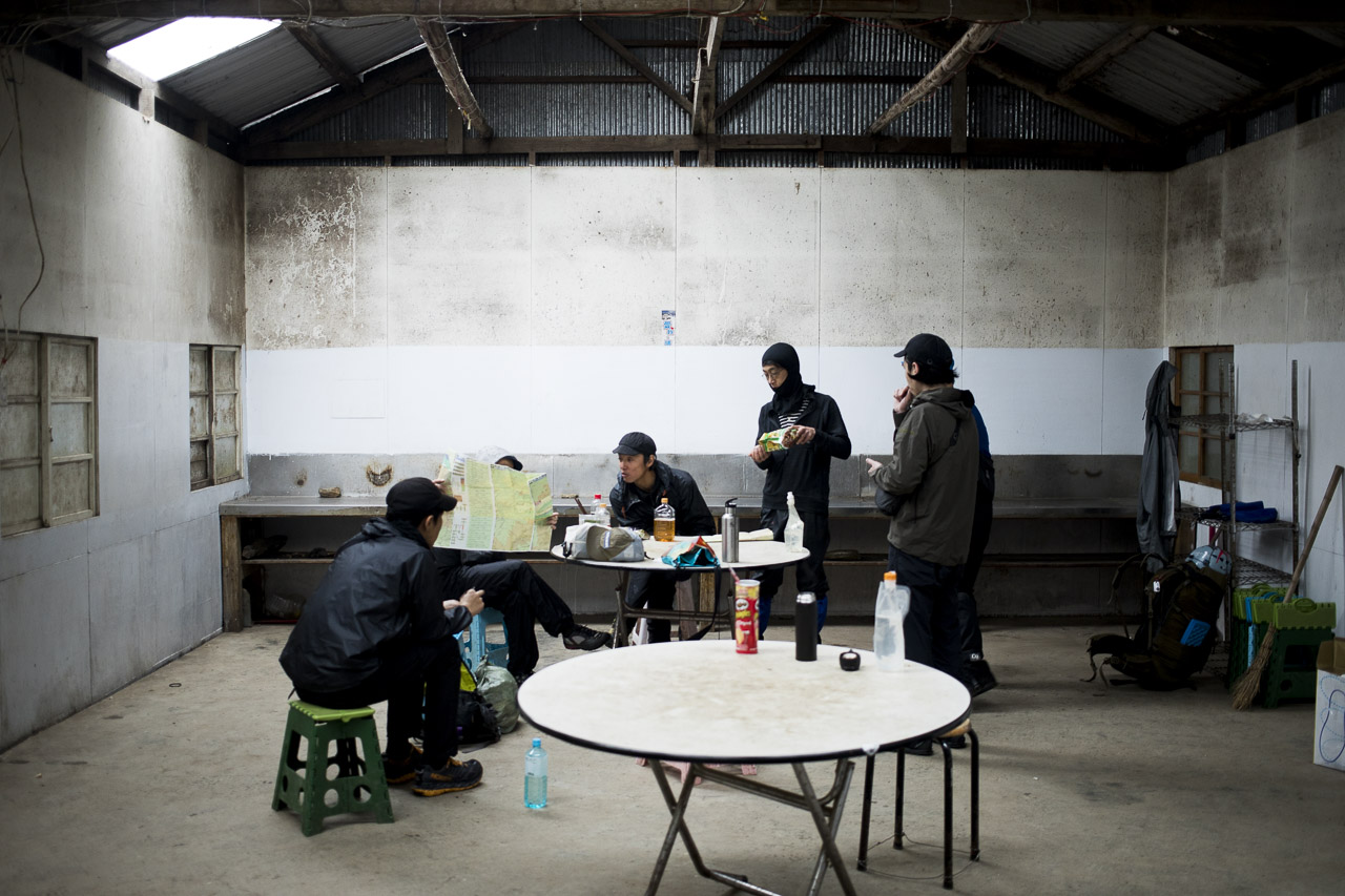 途中で合計1時間ほどの休憩を挟みつつ、午後2時に三六九山荘に着いた。三六九山荘も大きな小屋で、2段になった寝室は100名ほどは眠れそうだった。離れには水道も流しもあるキッチンスペースがあり、香港やシンガポールから来たパーティですでに賑わっていた。