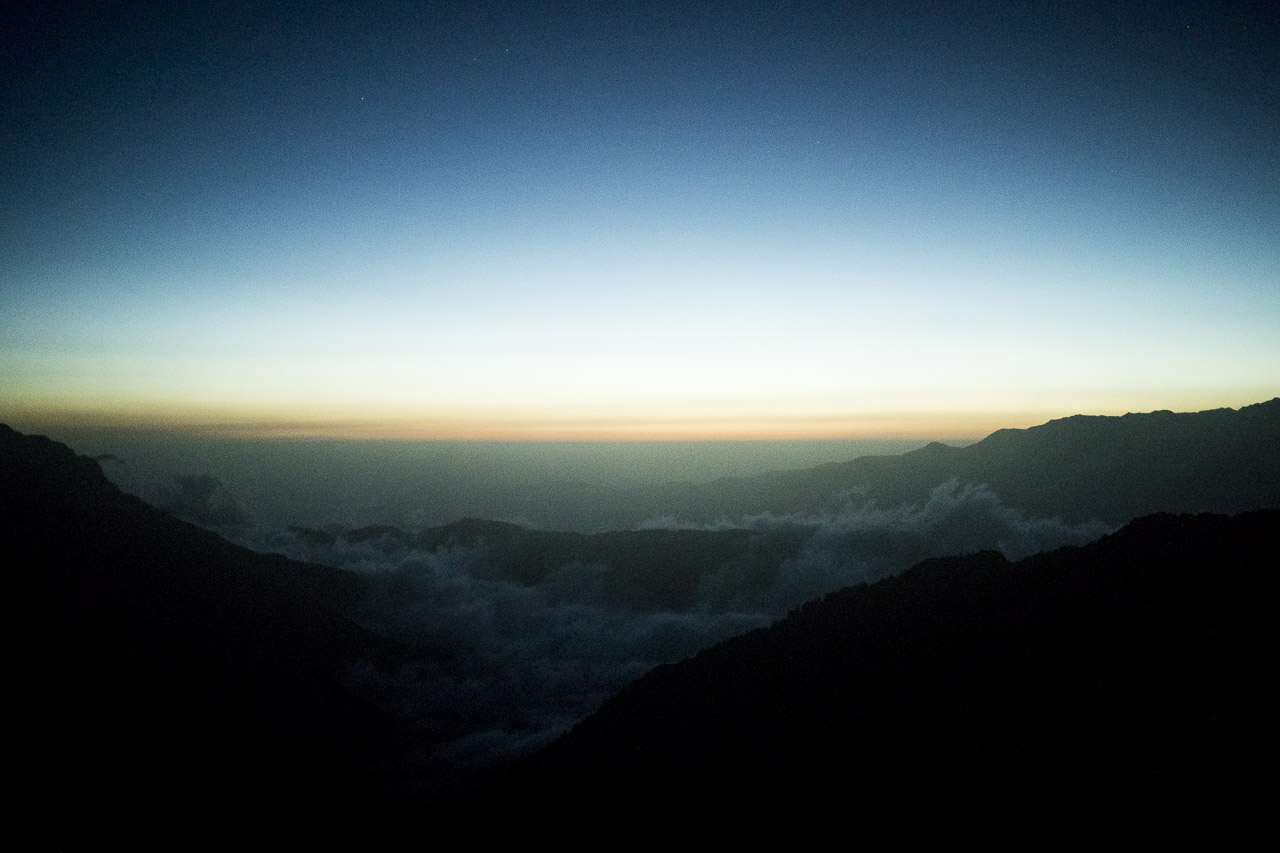 予定していたAM3:00に皆きちんと起床して、自炊場に移動して各々朝食を食べた。 僕は普段から朝食は食べないのでホットコーヒーとお菓子を口に入れただけで、準備を整え5時前には出発した。 ヘッドランプを点けて歩き始めると、あたりはまだ真っ暗で、空には星が見えていた。