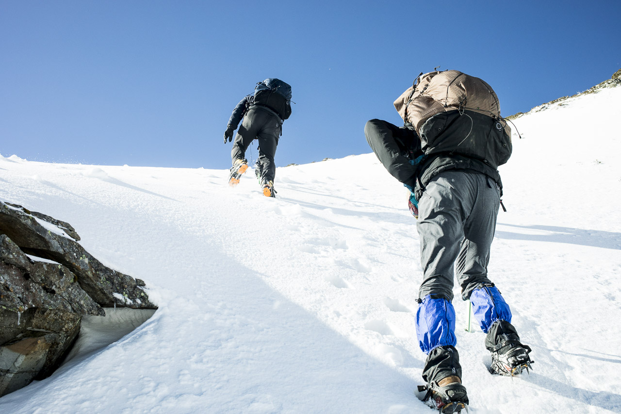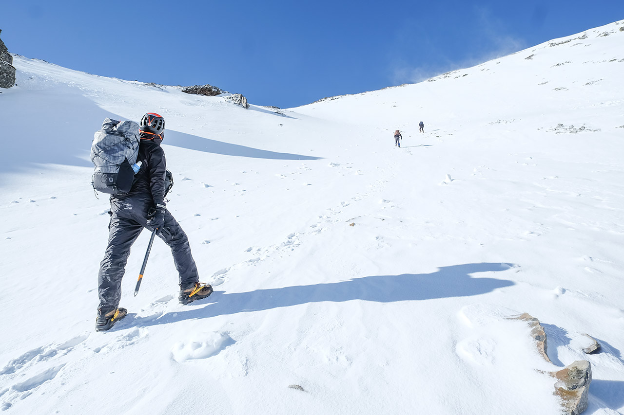 カールに登る手前でチェーンスパイクから12本爪のクランポンに履き替え、ピッケル、ヘルメットを装備。少し緊張感が増す。ここまで一緒に登ってきたヘクターはチェーンスパイクしか持ってきていなかったので、安全のために残ることに。この冬もニセコで毎日バックカントリーを滑っている豊島さんが先頭となり、足場を形成。グイグイとカールを攻めていく。