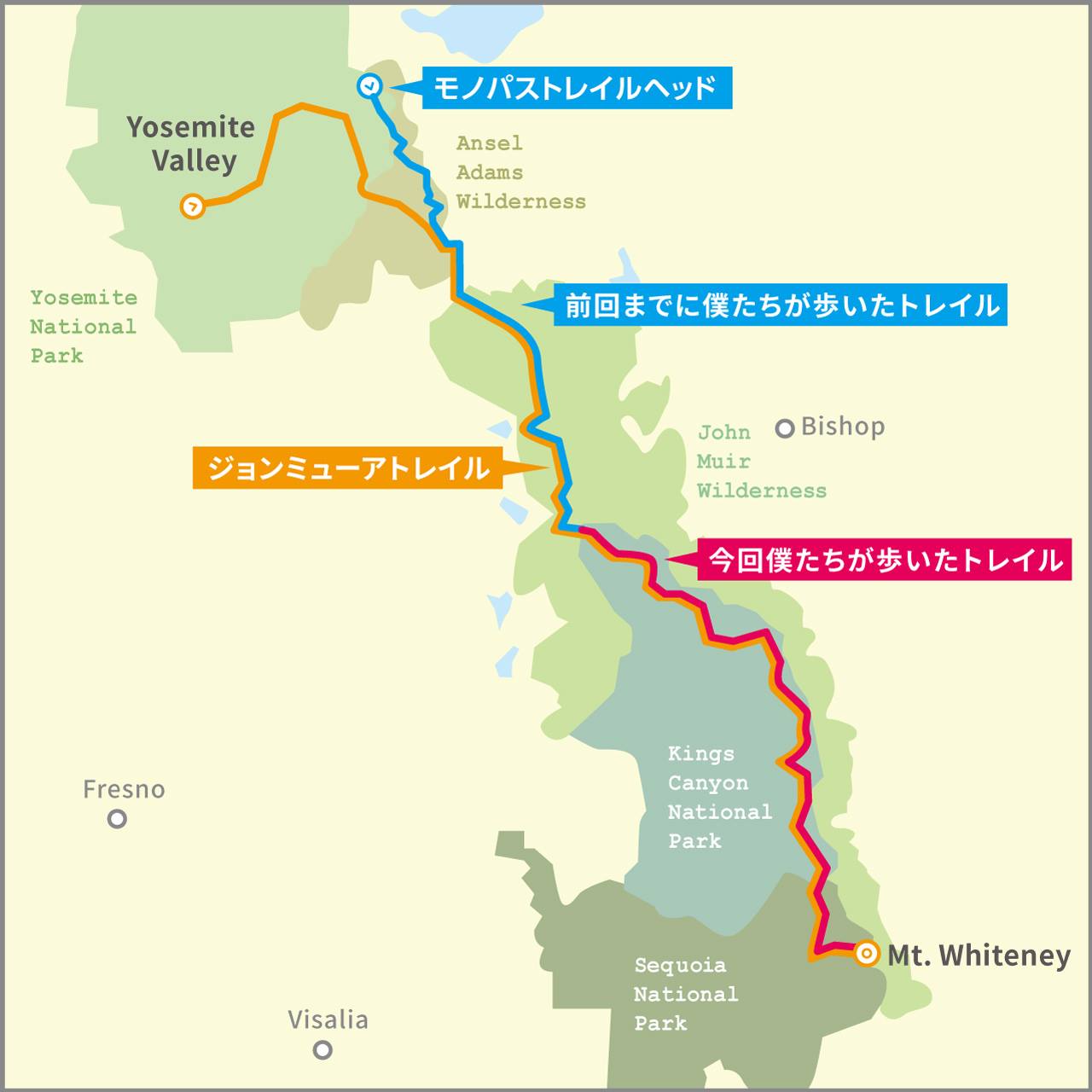 カリフォルニア州シェラネヴァダ山脈に340km渡って伸びるジョン・ミューア・トレイル(JMT)は、ハイカーの聖地であり、トレイルのなかのトレイルです。そんなJMTを山と道スタッフであり、自身もRidge Mountain Gearとして活動する黒澤雄介が、2016年に夫婦で歩いた記録、その第3回目です。
