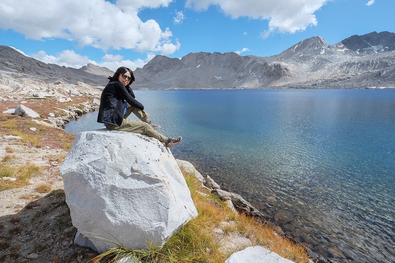 本日2番目の湖のワンダ・レイク。ここは今まで通ってきた湖の中で抜群に水が綺麗だった。暑ければ泳ぎたいくらいなのだけれど、日向でもフリースを着てちょうどいい位の気温だった。先ほど通過したエボリューション・レイクからすぐに雲行きが怪しくなり、瞬く間に空は真っ黒になり、強い風が吹いた。小雪も舞うほどだったので、ここへ到着する頃には少し青空が見えたので安心した。