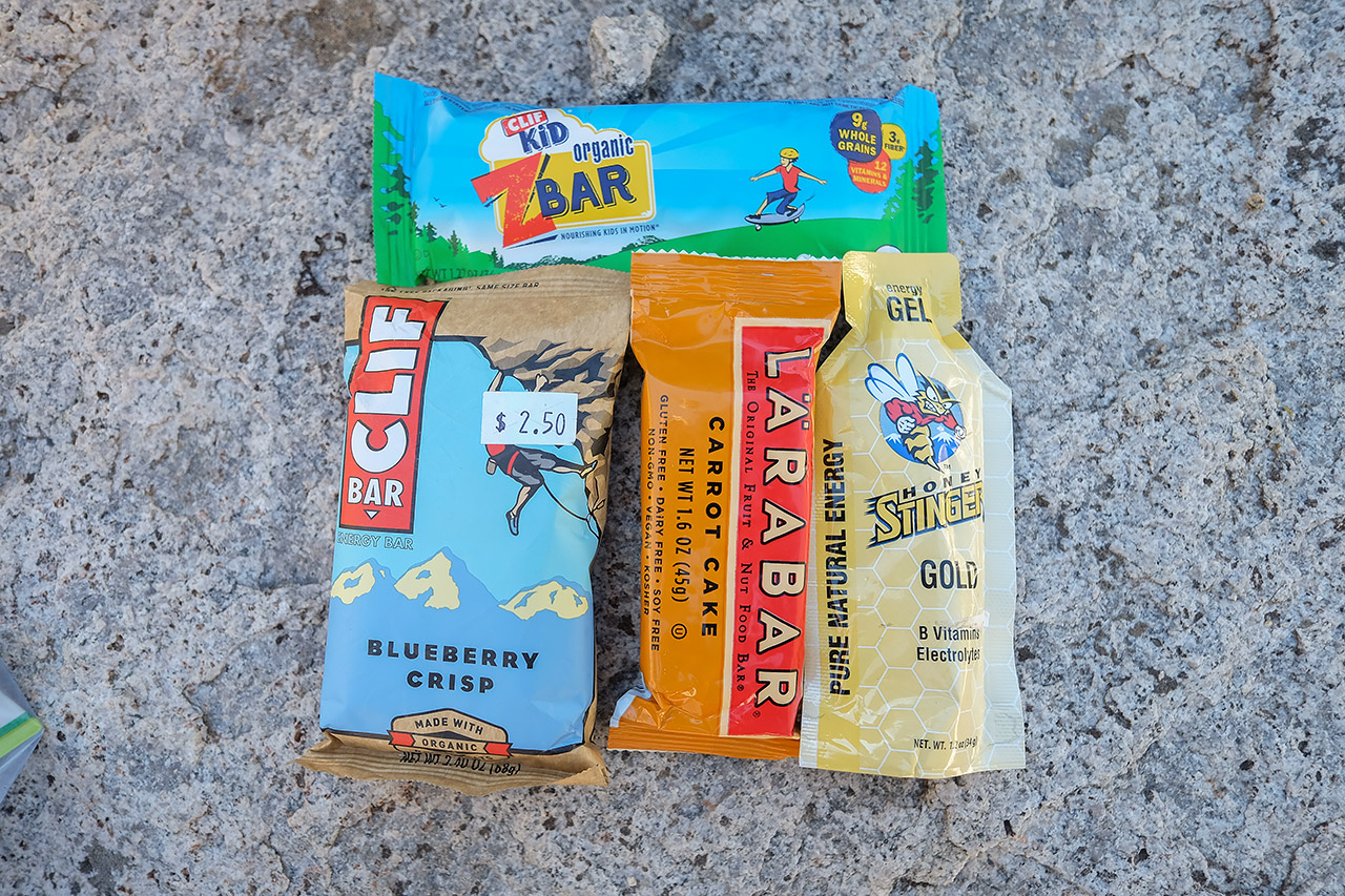 僕は普段の生活でも朝食をあまり食べないので、朝はスープだけを飲み体を温め、歩き出してから行動食を食べる。写真上が2人分の1日の行動食。バー3本と必要によりエナジージェル。これが2人分の昼食と行動食だった。