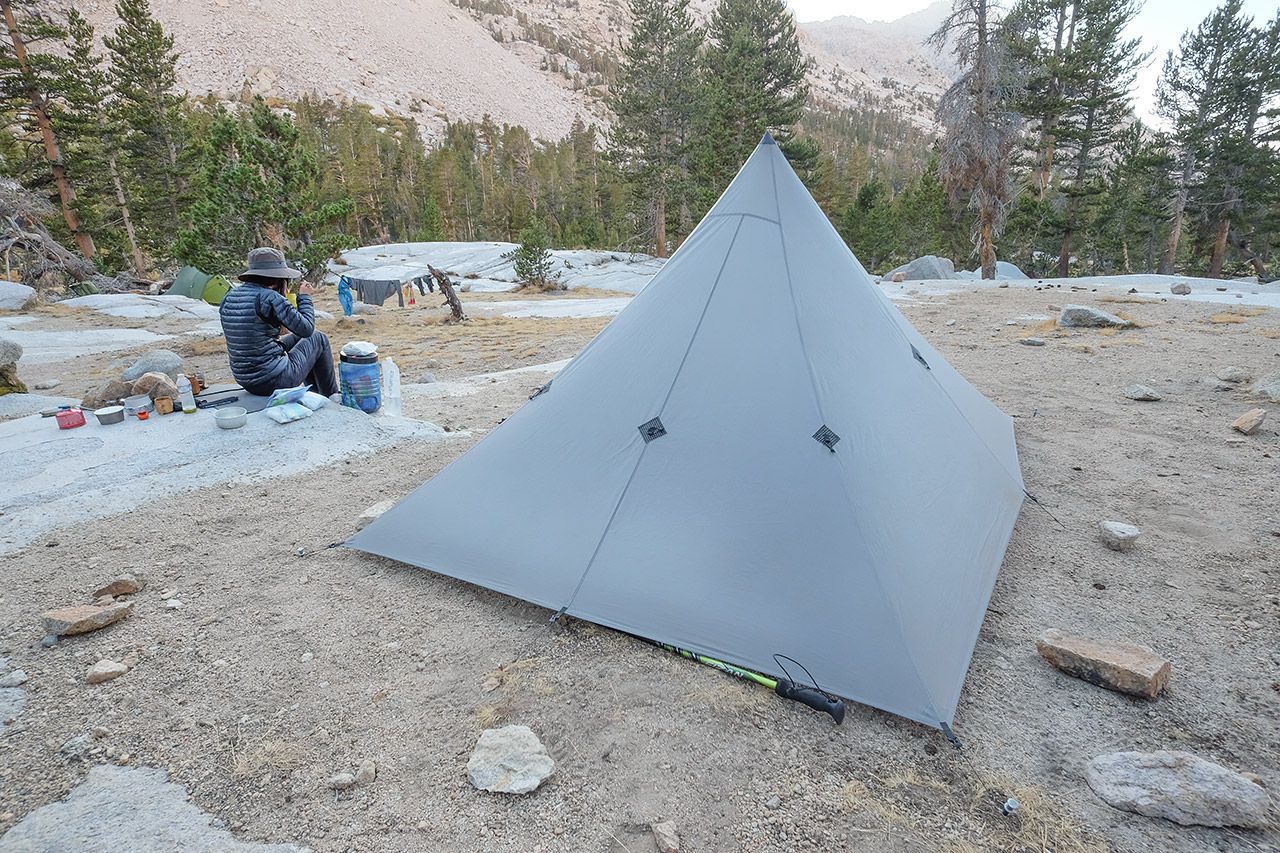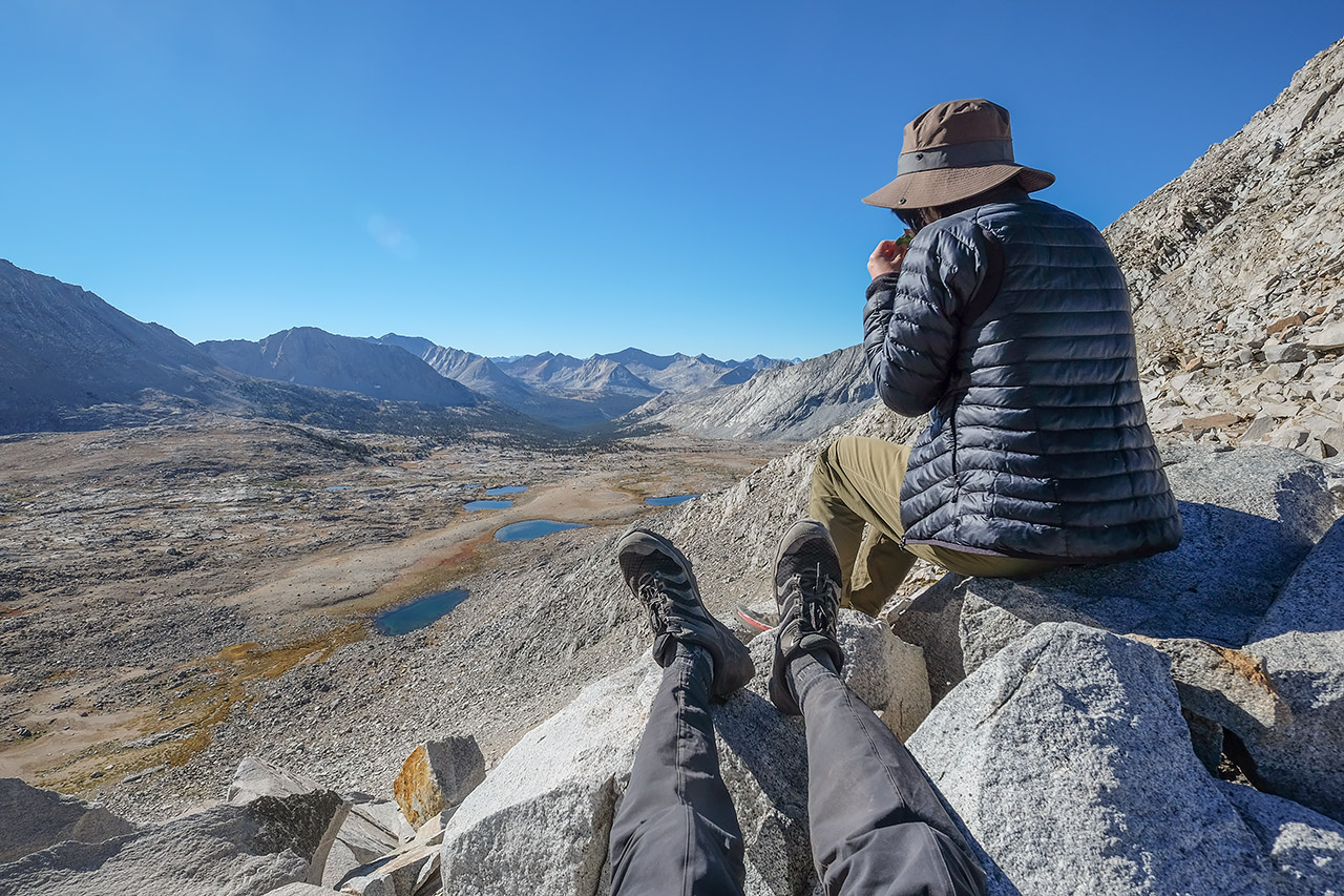この日も朝イチで峠を超える。そのピンチョット・パスを登りきったところで朝食を食べていると、HMGのバックパックを背負ったハイカーが、僕らの山と道のONEに興味津々で話しかけてきた。