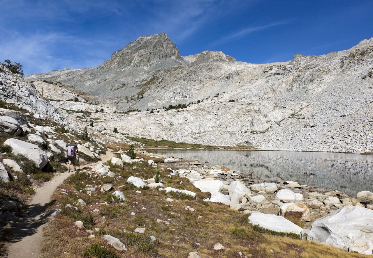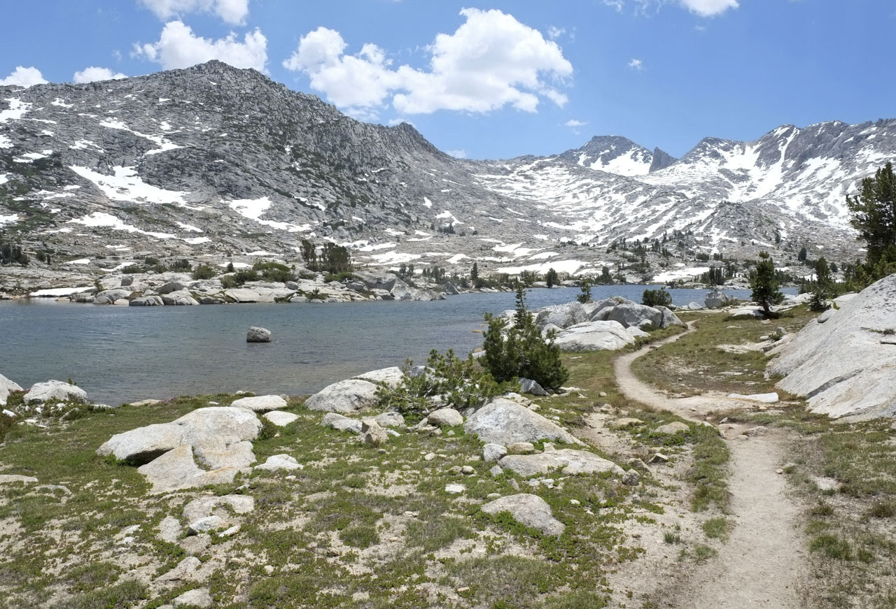JMTの最大の魅力はウィルダネスの景観美だと思う。トレイルは基本的にパス(峠)を越えては下りを繰り返し、ひたすら進んでいく一歩道。途中、大小多くの湖があり、 どれも美しい。日本の山と比べると「ザ・登山!」という感じではなく、比較的緩やかに登り下りする。スイッチバック (つづら折りの道)も日本より多用されている気が。ただし、雪の残っている年は要注意で、標高の高いパス越えの際はトレイルが埋まっているため、雪のトレース跡を進むことになり、なかなかハードなルートになる場合も。