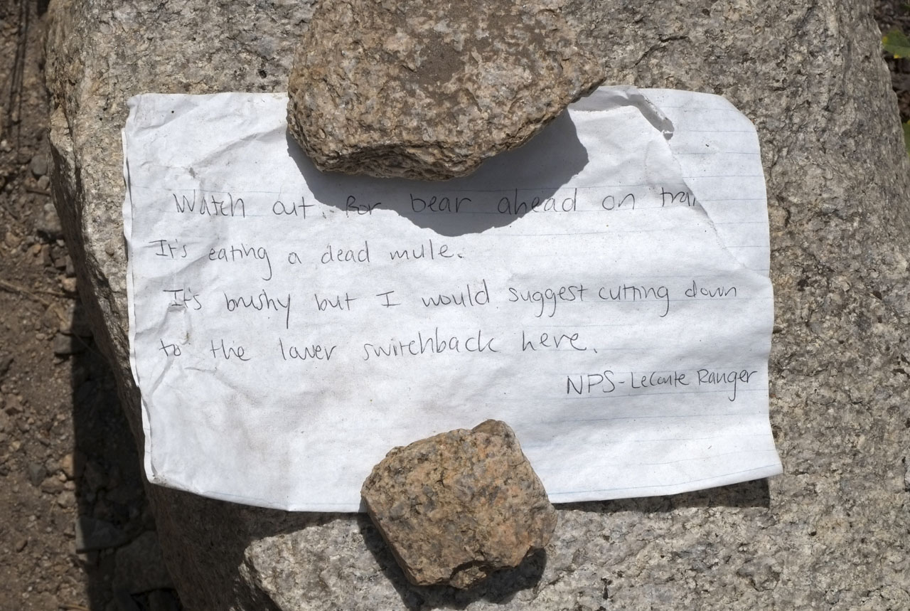 画像はレンジャーの置手紙。 「この先に熊がいる。熊は死んだミュール(鹿)を食べている。ここからトレイルをショートカットして下に進んだ方がよい」 熊は遠目では見たいけど・・・。