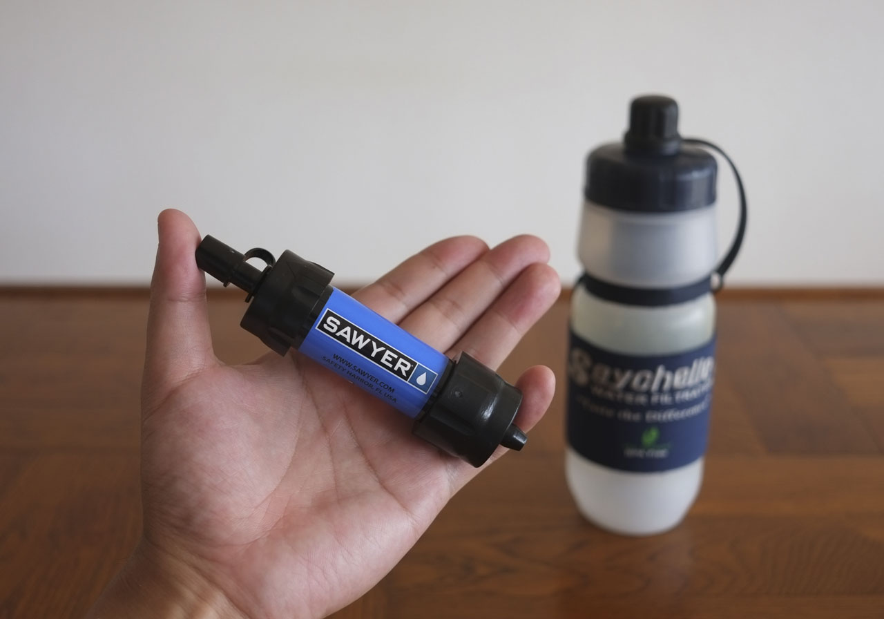 湖や小川の水は生で飲むと腹を下す場合があるため、浄水器が必須。 最初の内はセイシェル(右上画像奥)を使っていたけど、ここ数年はよりコンパクトなソーヤーミニを愛用。キャップ代わりにプラティパス等に取り付けた状態で使用している。